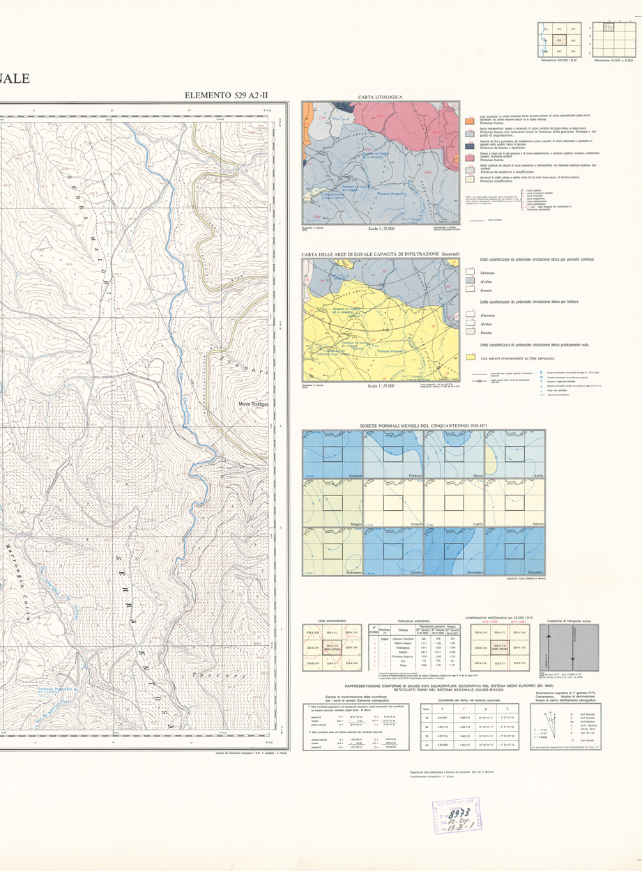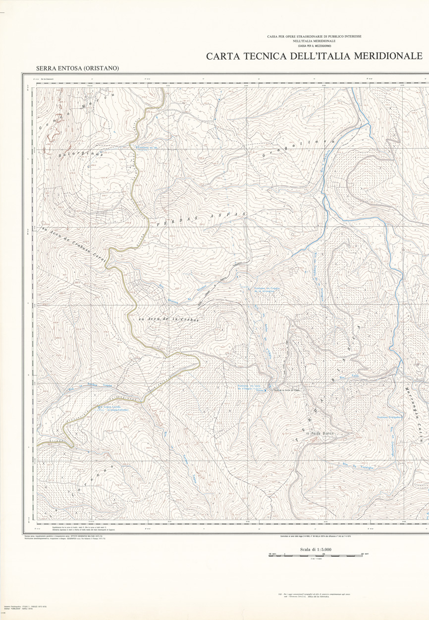 "Rappresentazione orografica a curve di livello, l'equidistanza fra le curve di livello: metri 5 per le curve a tratti metri 1. Altimetria espressa in metri e riferita al livello medio del mare (mareografo di Cagliari). Ripresa aerea, inquadramento geodetico e triangolazione aerea: I.G.M. restituzione aereofotogrammetrica, ricognizione e disegno: Geografica s.a.s. (FI). Impianto fotolitografico: Studio 3 (FI). Stampa: Pubbligraf, Napoli."