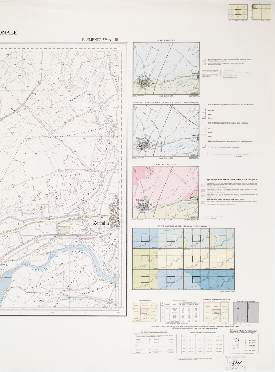 "Rappresentazione orografica a curve di livello, l'equidistanza fra le curve di livello: metri 5 per le curve a tratti metri 1. Altimetria espressa in metri e riferita al livello medio del mare (mareografo di Cagliari). Ripresa aerea, inquadramento geodetico e triangolazione aerea: I.G.M. restituzione aereofotogrammetrica, ricognizione e disegno: Aerofotogrammetria Ing. Barigazzi & C. s.n.c., Parma. Impianto cromo-fotolitografico: Ordis, Piacenza. Stampa: Pubbligraf, Napoli."