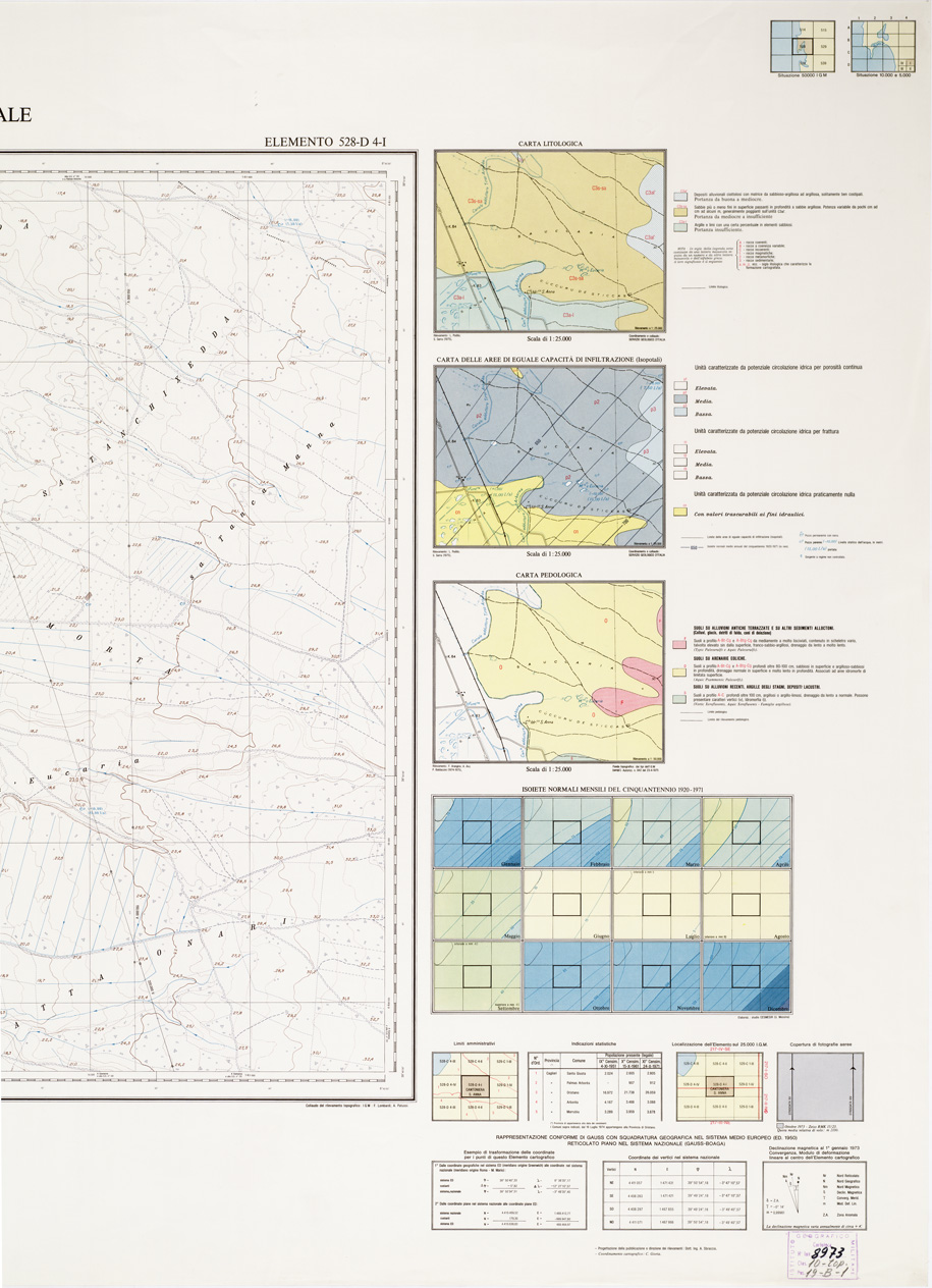 "Rappresentazione orografica a curve di livello, l'equidistanza fra le curve di livello: metri 5 per le curve a tratti metri 1. Altimetria espressa in metri e riferita al livello medio del mare (mareografo di Cagliari). Ripresa aerea, inquadramento geodetico e triangolazione aerea: I.G.M. restituzione aereofotogrammetrica, ricognizione e disegno: Impresa I. Benedetti(FI). Impianto cromo-fotolitografico: Geographicus(FI). Stampa: Pubbligraf, Napoli."