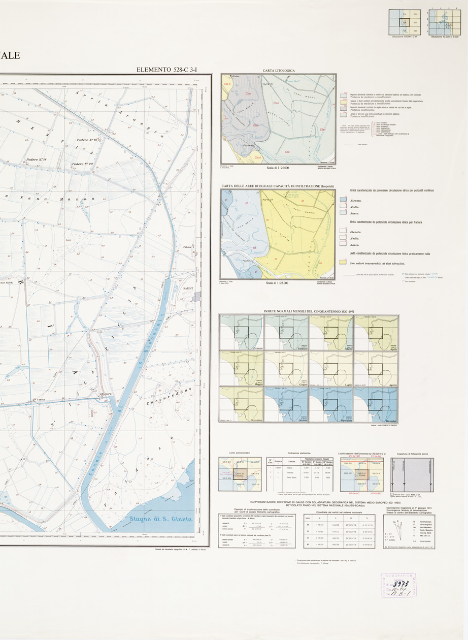 "Rappresentazione orografica a curve di livello, l'equidistanza fra le curve di livello: metri 5 per le curve a tratti metri 1. Altimetria espressa in metri e riferita al livello medio del mare (mareografo di Cagliari). Ripresa aerea, inquadramento geodetico e triangolazione aerea: I.G.M. restituzione aereofotogrammetrica, ricognizione e disegno: Impresa I. Benedetti (FI). Impianto cromo-fotolitografico: Geographicus (FI). Stampa: Pubbligraf, Napoli."