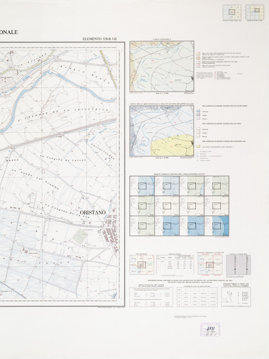 "Rappresentazione orografica a curve di livello, l'equidistanza fra le curve di livello: metri 5 per le curve a tratti metri 1. Altimetria espressa in metri e riferita al livello medio del mare (mareografo di Cagliari). Ripresa aerea, inquadramento geodetico e triangolazione aerea: I.G.M. restituzione aereofotogrammetrica, ricognizione e disegno: Aerofotogrammetria Ing. Barigazzi & C. s.n.c., Parma. Impianto cromo-fotolitografico: Ordis, Piacenza. Stampa: Pubbligraf, Napoli."