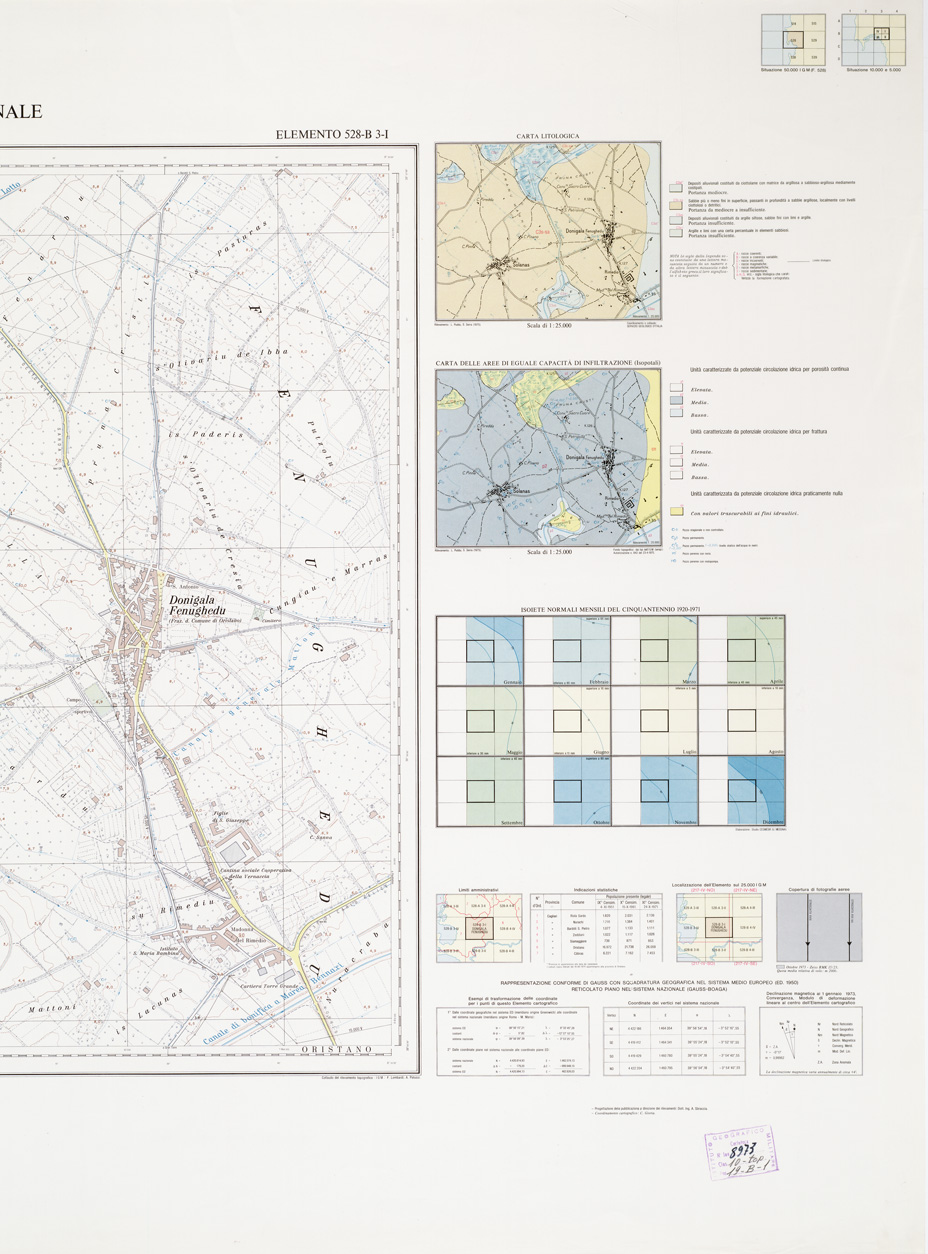 "Rappresentazione orografica a curve di livello, l'equidistanza fra le curve di livello: metri 5 per le curve a tratti metri 1. Altimetria espressa in metri e riferita al livello medio del mare (mareografo di Cagliari). Ripresa aerea, inquadramento geodetico e triangolazione aerea: I.G.M. restituzione aereofotogrammetrica, ricognizione e disegno: Aerofotogrammetria Ing. Barigazzi & C. s.n.c., Parma. Impianto cromo-fotolitografico: Ordis, Piacenza. Stampa: Pubbligraf, Napoli."