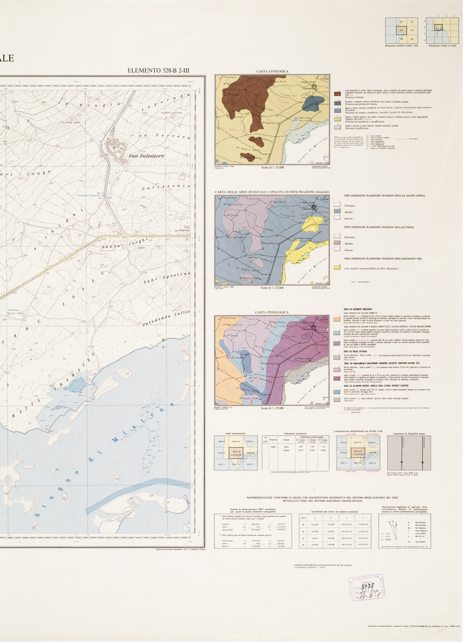 "Rappresentazione orografica a curve di livello, l'equidistanza fra le curve di livello: metri 5 per le curve a tratti metri 1. Altimetria espressa in metri e riferita al livello medio del mare (mareografo di Cagliari). Ripresa aerea, inquadramento geodetico e triangolazione aerea: I.G.M. (FI). Impianto cromo-fotolitografico: Ordis, Piacenza. Stampa: Pubbligraf, Napoli."