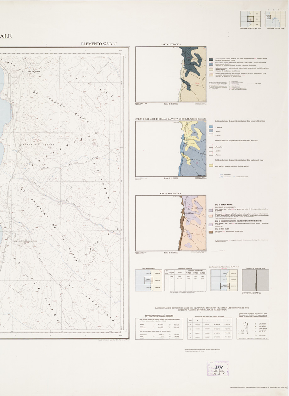 "Rappresentazione orografica a curve di livello, l'equidistanza fra le curve di livello: metri 5 per le curve a tratti metri 1. Altimetria espressa in metri e riferita al livello medio del mare (mareografo di Cagliari). Ripresa aerea, inquadramento geodetico e triangolazione aerea: I.G.M. (FI). Impianto cromo-fotolitografico: Ordis, Piacenza. Stampa: Pubbligraf, Napoli."
