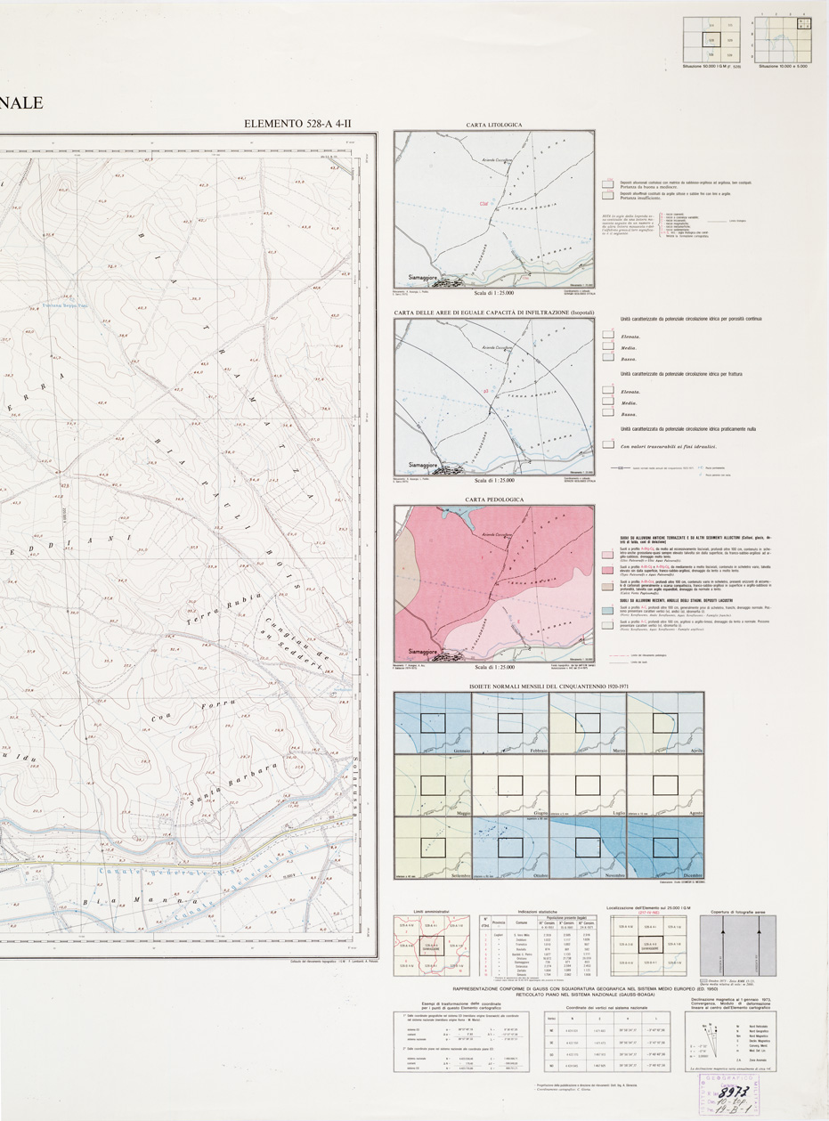 "Rappresentazione orografica a curve di livello, l'equidistanza fra le curve di livello: metri 5 per le curve a tratti metri 1. Altimetria espressa in metri e riferita al livello medio del mare (mareografo di Cagliari). Ripresa aerea, inquadramento geodetico e triangolazione aerea: I.G.M. restituzione aereofotogrammetrica, ricognizione e disegno: Aerofotogrammetria Ing. Barigazzi & C. s.n.c., Parma. Impianto cromo-fotolitografico: Ordis, Piacenza. Stampa: Pubbligraf, Napoli."