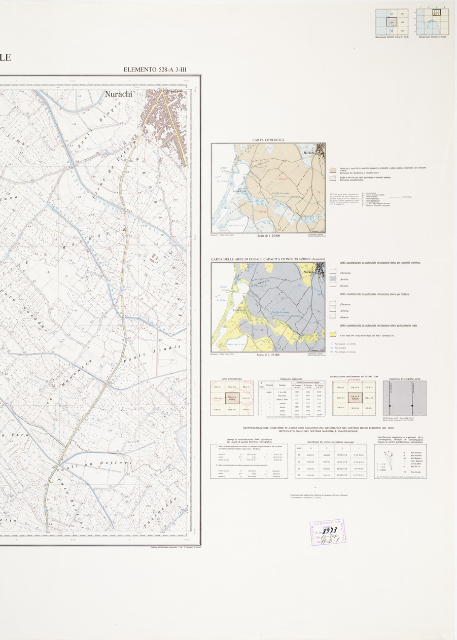 "Rappresentazione orografica a curve di livello, l'equidistanza fra le curve di livello: metri 5 per le curve a tratti metri 1. Altimetria espressa in metri e riferita al livello medio del mare (mareografo di Cagliari). Ripresa aerea, inquadramento geodetico e triangolazione aerea: I.G.M. restituzione aereofotogrammetrica, ricognizione e disegno: Aerofotogrammetria Ing. Barigazzi & C. s.n.c., Parma. Impianto cromo-fotolitografico: Ordis, Piacenza. Stampa: Pubbligraf, Napoli."