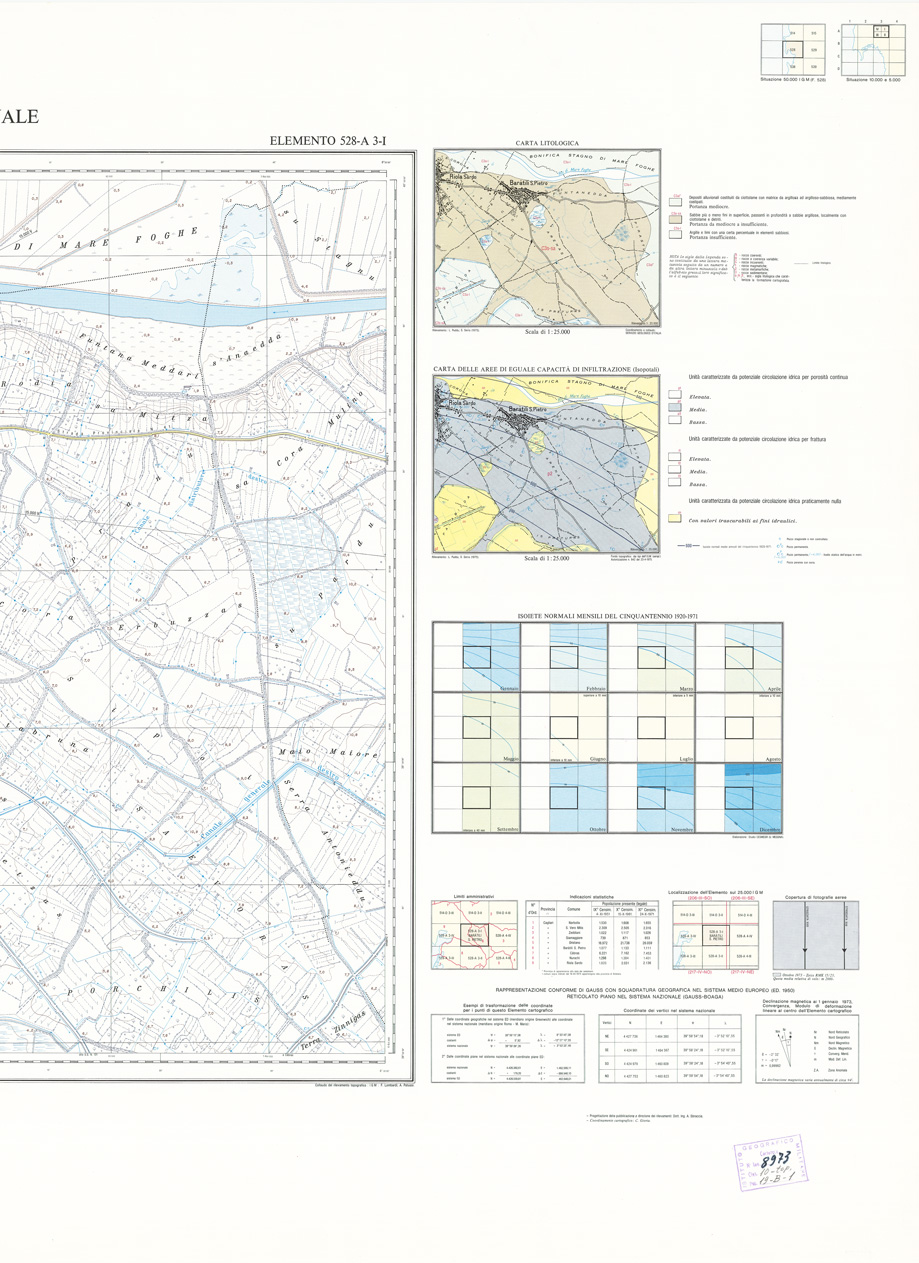 "Rappresentazione orografica a curve di livello, l'equidistanza fra le curve di livello: metri 5 per le curve a tratti metri 1. Altimetria espressa in metri e riferita al livello medio del mare (mareografo di Cagliari). Ripresa aerea, inquadramento geodetico e triangolazione aerea: I.G.M. restituzione aereofotogrammetrica, ricognizione e disegno: Aerofotogrammetria Ing. Barigazzi & C. s.n.c., Parma. Impianto cromo-fotolitografico: Ordis, Piacenza. Stampa: Pubbligraf, Napoli."