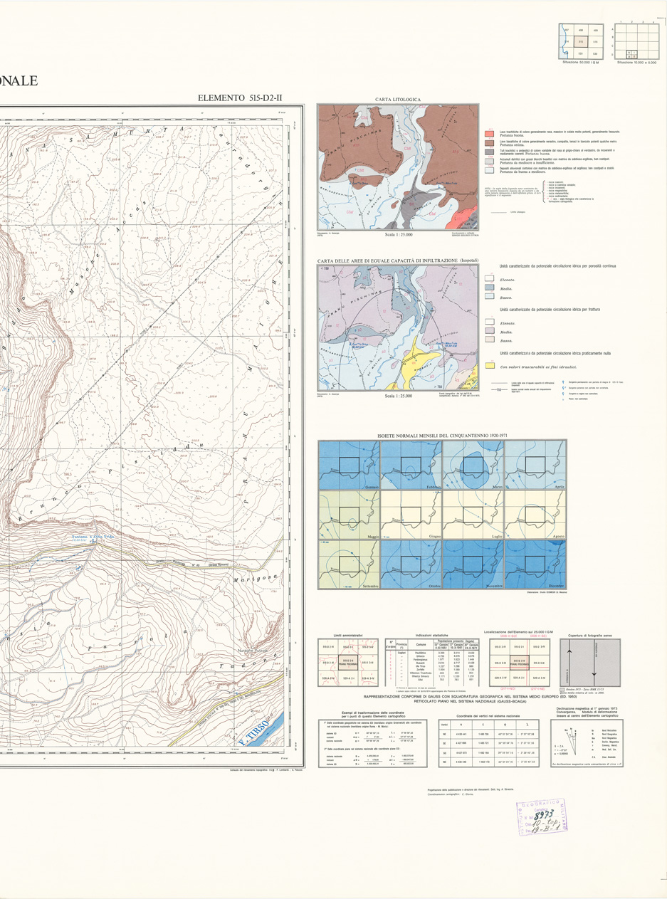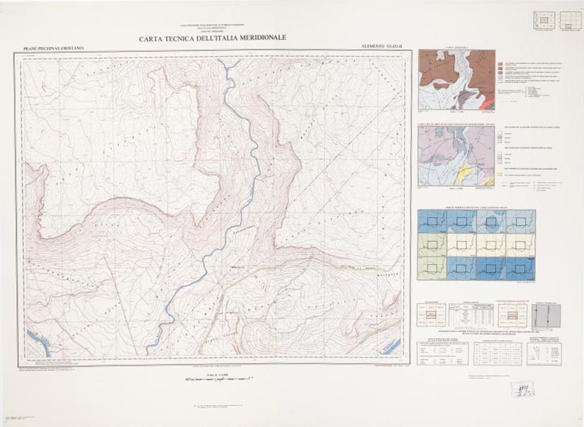 "Rappresentazione orografica a curve di livello, l'equidistanza fra le curve di livello: metri 5 per le curve a tratti metri 1. Altimetria espressa in metri e riferita al livello medio del mare (mareografo di Cagliari). Ripresa aerea, inquadramento geodetico e triangolazione aerea: I.G.M. restituzione aereofotogrammetrica, ricognizione e disegno: Geografica s.a.s. (FI). Impianto fotolitografico: Studio 3 (FI). Stampa: Pubbligraf, Napoli."