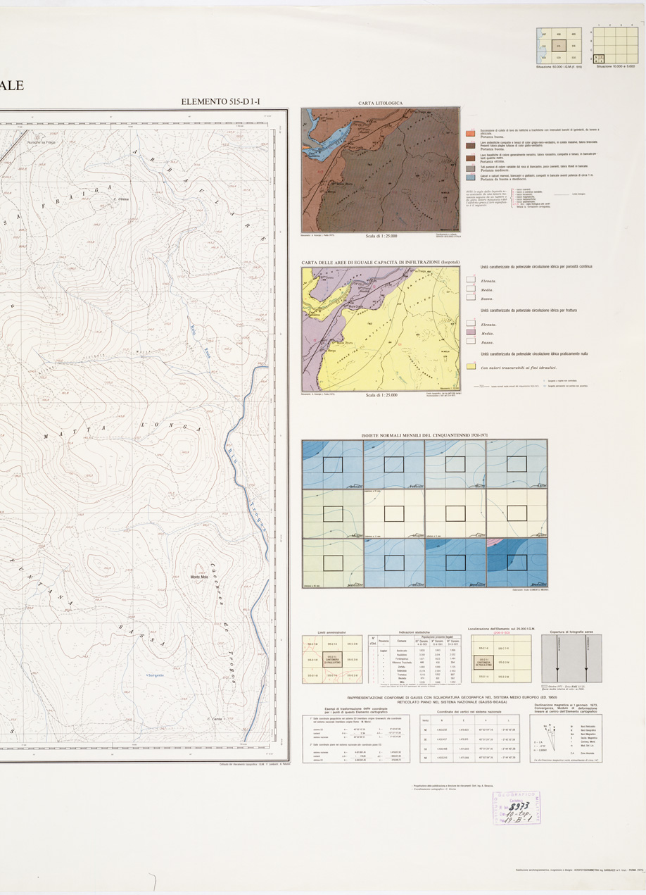 "Rappresentazione orografica a curve di livello, l'equidistanza fra le curve di livello: metri 5 per le curve a tratti metri 1. Altimetria espressa in metri e riferita al livello medio del mare (mareografo di Cagliari). Ripresa aerea, inquadramento geodetico e triangolazione aerea: I.G.M. (FI). Impianto cromo-fotolitografico: Ordis, Piacenza. Stampa: Pubbligraf, Napoli."