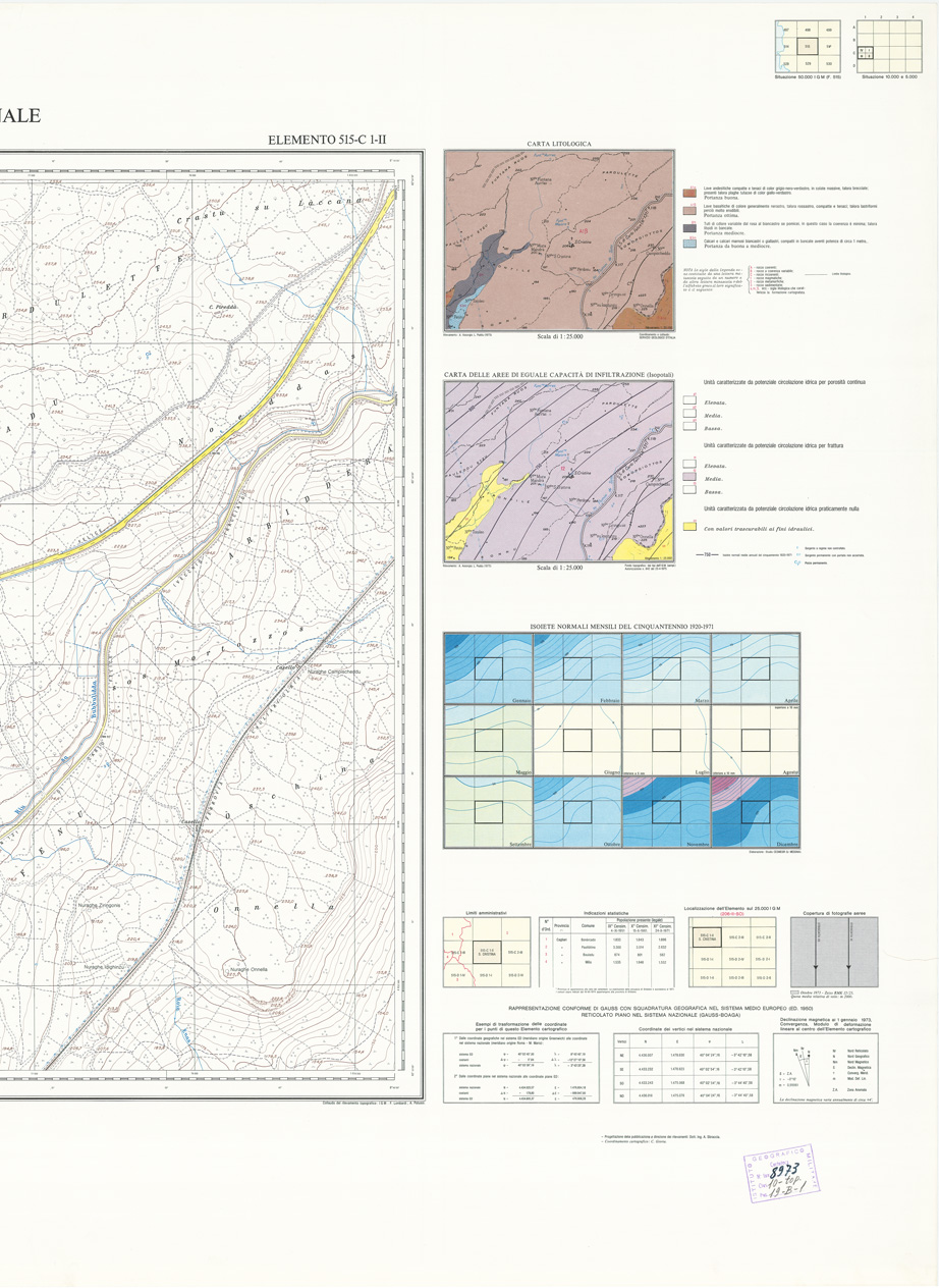 "Rappresentazione orografica a curve di livello, l'equidistanza fra le curve di livello: metri 5 per le curve a tratti metri 1. Altimetria espressa in metri e riferita al livello medio del mare (mareografo di Cagliari). Ripresa aerea, inquadramento geodetico e triangolazione aerea: I.G.M. restituzione aereofotogrammetrica, ricognizione e disegno: Aerofotogrammetria Ing. Barigazzi & C. s.n.c., Parma. Impianto fotolitografico: Ordis, Piacenza. Stampa: Pubbligraf, Napoli."