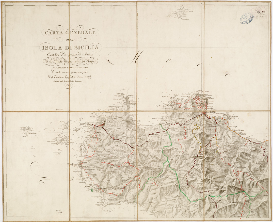 "...COMPILATA DISEGNATA ED INCISA NELL'OFFICIO TOPOGRAFICO DI NAPOLI SU I MIGLIORI MATERIALI ESISTENTI E SULLE RECENTI OPERAZIONI FATTE DAL CAVALIERE ERRICO SMYTH CAPITANO DELLA REALE MARINA BRITANNICA. Questa è la copia montata su tela a stacchi con aggiunti a mano i confini e le strade carrozzabili (come riporta la descrizione nella didascalia). Carta in quattro fogli incisi su rame pubblicata dall'Officio Topografico di Napoli dopo che, perduti i rami della edizione rinnovata del 1809-10 della carta dello Schmettau (v. n. 7 d'ordine Cart. n. 92, Docum. n. 1) durante i moti del 1820, venne decisa questa nuova edizione per la quale vennero impiegati anche i nuovi rilievi idrografici compiuti dal Capitano Smyth incaricato dall'Ammiragliato Britannico. La carta mostra il rilievo orografico mediante tratteggio a luce obliqua distingue gli abitati secondo la loro importanza amministrativa, gli arcivescovadi, i vescovadi, i confini di valle, di distretto, di circondario, il telegrafo, le torri di segnale, i castelli, i molini le strade sono classificate in rotabili, per cavalli e sentieri: gli scandagli sono espressi in tese e piedi parigini. Due copie una delle quali in fogli montati su tela a stacchi, con aggiunti a mano i confini delle "valli" a colore verde e il tracciato delle strade carrozzabili in costruzione in rosso l'altra evidentemente una ristampa posteriore al 1860, con aggiunte le ferrovie in esercizio. Cfr. anche: la stessa carta ai numeri di Files B0005164-67 - Inv. Gen. 1887. In Biblioteca al numero d'Inv. Gen. 1735 c'è la stessa carta corrispondente ai numeri di files B0005164-67 ma mancante di un foglio. In appartenenza alla Biblioteca e all'Archivio sono una serie di carte sull'Isola di Sicilia pubblicate in anni diversi ma collegate fra loro. Questo il quadro riassuntivo di tali documenti: N° 7 d'ordine - Cart. d'Arch. 92 Docum. 1- anno 1809-10 N° 11 d'ordine - Inv. gen. 1735 bis - Files B0005160-63 - anno 1826 - copia su tela - Inv. gen. 1887 - Files B0005164-67 - anno 1826 - Inv. gen. 1887 ter - Files B0005172-75 - anno 1860 N° 17 d'ordine - Inv. gen. 1735 - anno 1826 - - Inv. gen. 1887 bis - Files B0005168-71 - anno 1860 N° 18 d'ordine - Inv. gen. 1766 - Files B0005335-38 - anno 1860"