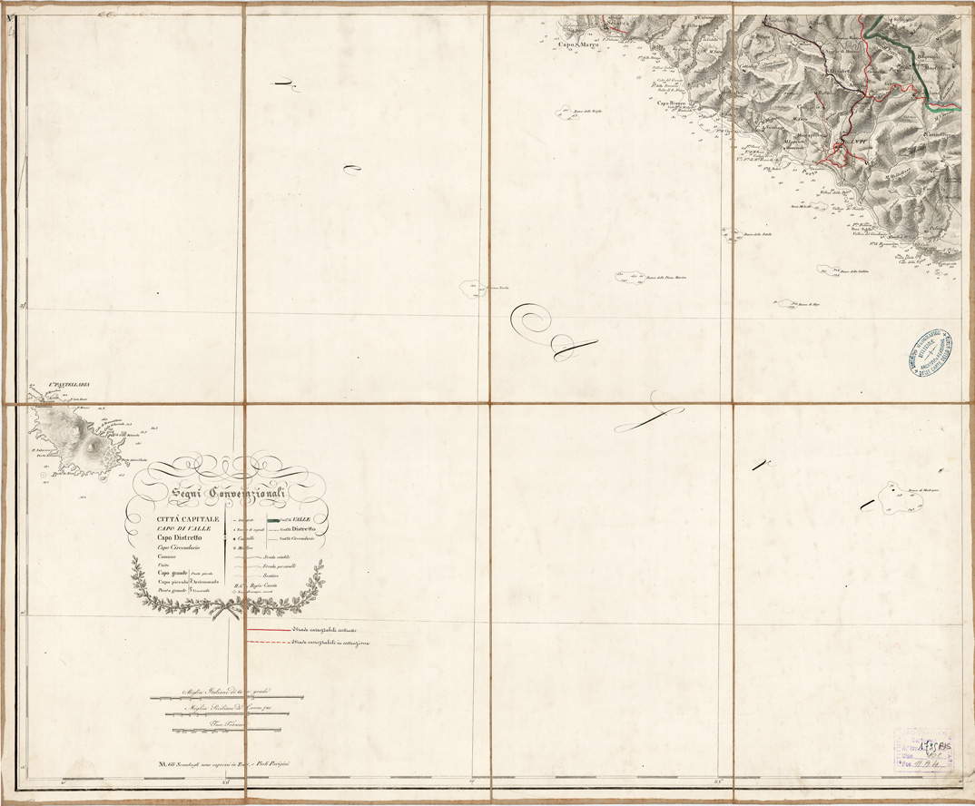 "...COMPILATA DISEGNATA ED INCISA NELL'OFFICIO TOPOGRAFICO DI NAPOLI SU I MIGLIORI MATERIALI ESISTENTI E SULLE RECENTI OPERAZIONI FATTE DAL CAVALIERE ERRICO SMYTH CAPITANO DELLA REALE MARINA BRITANNICA. Questa è la copia montata su tela a stacchi con aggiunti a mano i confini e le strade carrozzabili (come riporta la descrizione nella didascalia). Carta in quattro fogli incisi su rame pubblicata dall'Officio Topografico di Napoli dopo che, perduti i rami della edizione rinnovata del 1809-10 della carta dello Schmettau (v. n. 7 d'ordine Cart. n. 92, Docum. n. 1) durante i moti del 1820, venne decisa questa nuova edizione per la quale vennero impiegati anche i nuovi rilievi idrografici compiuti dal Capitano Smyth incaricato dall'Ammiragliato Britannico. La carta mostra il rilievo orografico mediante tratteggio a luce obliqua distingue gli abitati secondo la loro importanza amministrativa, gli arcivescovadi, i vescovadi, i confini di valle, di distretto, di circondario, il telegrafo, le torri di segnale, i castelli, i molini le strade sono classificate in rotabili, per cavalli e sentieri: gli scandagli sono espressi in tese e piedi parigini. Due copie una delle quali in fogli montati su tela a stacchi, con aggiunti a mano i confini delle "valli" a colore verde e il tracciato delle strade carrozzabili in costruzione in rosso l'altra evidentemente una ristampa posteriore al 1860, con aggiunte le ferrovie in esercizio. Cfr. anche: la stessa carta ai numeri di Files B0005164-67 - Inv. Gen. 1887. In Biblioteca al numero d'Inv. Gen. 1735 c'è la stessa carta corrispondente ai numeri di files B0005164-67 ma mancante di un foglio. In appartenenza alla Biblioteca e all'Archivio sono una serie di carte sull'Isola di Sicilia pubblicate in anni diversi ma collegate fra loro. Questo il quadro riassuntivo di tali documenti: N° 7 d'ordine - Cart. d'Arch. 92 Docum. 1- anno 1809-10 N° 11 d'ordine - Inv. gen. 1735 bis - Files B0005160-63 - anno 1826 - copia su tela - Inv. gen. 1887 - Files B0005164-67 - anno 1826 - Inv. gen. 1887 ter - Files B0005172-75 - anno 1860 N° 17 d'ordine - Inv. gen. 1735 - anno 1826 - - Inv. gen. 1887 bis - Files B0005168-71 - anno 1860 N° 18 d'ordine - Inv. gen. 1766 - Files B0005335-38 - anno 1860"