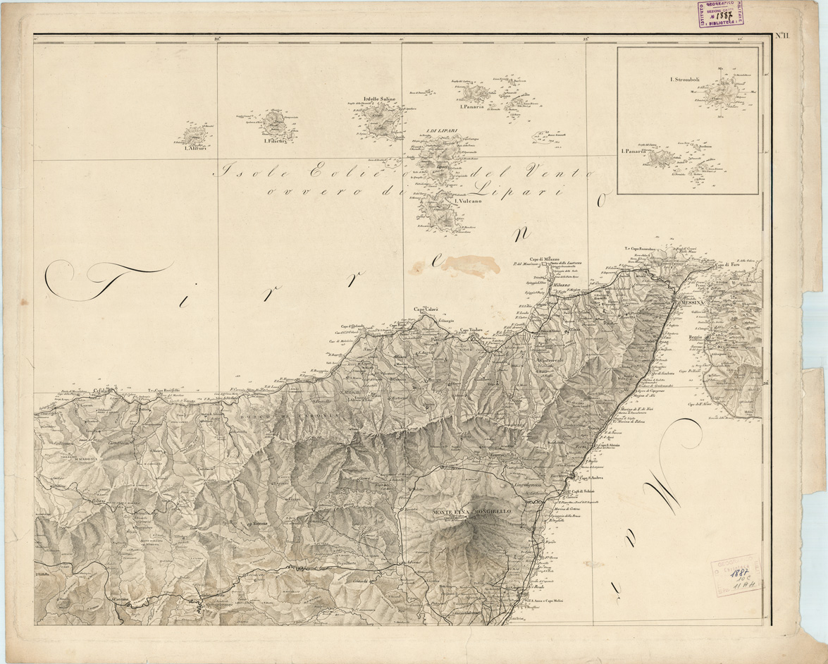 "...COMPILATA DISEGNATA ED INCISA NELL'OFFICIO TOPOGRAFICO DI NAPOLI SU I MIGLIORI MATERIALI ESISTENTI E SULLE RECENTI OPERAZIONI FATTE DAL CAVALIERE ERRICO SMYTH CAPITANO DELLA REALE MARINA BRITANNICA. Questa è la copia montata su tela a stacchi con aggiunti a mano i confini e le strade carrozzabili (come riporta la descrizione nella didascalia). Carta in quattro fogli incisi su rame pubblicata dall'Officio Topografico di Napoli dopo che, perduti i rami della edizione rinnovata del 1809-10 della carta dello Schmettau (v. n. 7 d'ordine Cart. n. 92, Docum. n. 1) durante i moti del 1820, venne decisa questa nuova edizione per la quale vennero impiegati anche i nuovi rilievi idrografici compiuti dal Capitano Smyth incaricato dall'Ammiragliato Britannico. La carta mostra il rilievo orografico mediante tratteggio a luce obliqua distingue gli abitati secondo la loro importanza amministrativa, gli arcivescovadi, i vescovadi, i confini di valle, di distretto, di circondario, il telegrafo, le torri di segnale, i castelli, i molini le strade sono classificate in rotabili, per cavalli e sentieri: gli scandagli sono espressi in tese e piedi parigini. Due copie una delle quali in fogli montati su tela a stacchi, con aggiunti a mano i confini delle "valli" a colore verde e il tracciato delle strade carrozzabili in costruzione in rosso l'altra evidentemente una ristampa posteriore al 1860, con aggiunte le ferrovie in esercizio. Cfr. anche: la stessa carta ai numeri di Files B0005164-67 - Inv. Gen. 1887. In Biblioteca al numero d'Inv. Gen. 1735 c'è la stessa carta corrispondente ai numeri di files B0005164-67 ma mancante di un foglio. In appartenenza alla Biblioteca e all'Archivio sono una serie di carte sull'Isola di Sicilia pubblicate in anni diversi ma collegate fra loro. Questo il quadro riassuntivo di tali documenti: N° 7 d'ordine - Cart. d'Arch. 92 Docum. 1- anno 1809-10 N° 11 d'ordine - Inv. gen. 1735 bis - Files B0005160-63 - anno 1826 - copia su tela - Inv. gen. 1887 - Files B0005164-67 - anno 1826 - Inv. gen. 1887 ter - Files B0005172-75 - anno 1860 N° 17 d'ordine - Inv. gen. 1735 - anno 1826 - - Inv. gen. 1887 bis - Files B0005168-71 - anno 1860 N° 18 d'ordine - Inv. gen. 1766 - Files B0005335-38 - anno 1860"