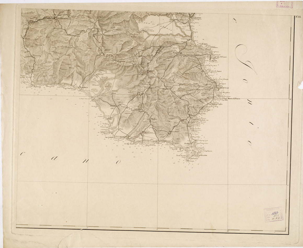 "...COMPILATA DISEGNATA ED INCISA NELL'OFFICIO TOPOGRAFICO DI NAPOLI SU I MIGLIORI MATERIALI ESISTENTI E SULLE RECENTI OPERAZIONI FATTE DAL CAVALIERE ERRICO SMYTH CAPITANO DELLA REALE MARINA BRITANNICA. Questa è la copia montata su tela a stacchi con aggiunti a mano i confini e le strade carrozzabili (come riporta la descrizione nella didascalia). Carta in quattro fogli incisi su rame pubblicata dall'Officio Topografico di Napoli dopo che, perduti i rami della edizione rinnovata del 1809-10 della carta dello Schmettau (v. n. 7 d'ordine Cart. n. 92, Docum. n. 1) durante i moti del 1820, venne decisa questa nuova edizione per la quale vennero impiegati anche i nuovi rilievi idrografici compiuti dal Capitano Smyth incaricato dall'Ammiragliato Britannico. La carta mostra il rilievo orografico mediante tratteggio a luce obliqua distingue gli abitati secondo la loro importanza amministrativa, gli arcivescovadi, i vescovadi, i confini di valle, di distretto, di circondario, il telegrafo, le torri di segnale, i castelli, i molini le strade sono classificate in rotabili, per cavalli e sentieri: gli scandagli sono espressi in tese e piedi parigini. Due copie una delle quali in fogli montati su tela a stacchi, con aggiunti a mano i confini delle "valli" a colore verde e il tracciato delle strade carrozzabili in costruzione in rosso l'altra evidentemente una ristampa posteriore al 1860, con aggiunte le ferrovie in esercizio. Cfr. anche: la stessa carta ai numeri di Files B0005164-67 - Inv. Gen. 1887. In Biblioteca al numero d'Inv. Gen. 1735 c'è la stessa carta corrispondente ai numeri di files B0005164-67 ma mancante di un foglio. In appartenenza alla Biblioteca e all'Archivio sono una serie di carte sull'Isola di Sicilia pubblicate in anni diversi ma collegate fra loro. Questo il quadro riassuntivo di tali documenti: N° 7 d'ordine - Cart. d'Arch. 92 Docum. 1- anno 1809-10 N° 11 d'ordine - Inv. gen. 1735 bis - Files B0005160-63 - anno 1826 - copia su tela - Inv. gen. 1887 - Files B0005164-67 - anno 1826 - Inv. gen. 1887 ter - Files B0005172-75 - anno 1860 N° 17 d'ordine - Inv. gen. 1735 - anno 1826 - - Inv. gen. 1887 bis - Files B0005168-71 - anno 1860 N° 18 d'ordine - Inv. gen. 1766 - Files B0005335-38 - anno 1860"