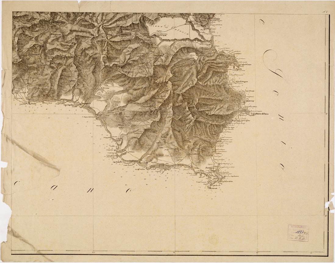 "...COMPILATA SUI MIGLIORI DOCUMENTI ESISTENTI. TORINO 1860. Ristampa del 1860. Carta in quattro fogli incisi su rame pubblicata dall'Officio Topografico di Napoli dopo che, perduti i rami della edizione rinnovata del 1809-10 della carta dello Schmettau (v. n. 7 d'ordine Cart. n. 97, Docum. n. 1) durante i moti del 1820, venne decisa questa nuova edizione per la quale vennero impiegati anche i nuovi rilievi idrografici compiuti dal Capitano Smyth incaricato dall'Ammiragliato Britannico. La carta mostra il rilievo orografico mediante tratteggio a luce obliqua distingue gli abitati secondo la loro importanza amministrativa, gli arcivescovadi, i vescovadi, i confini di valle, di distretto, di circondario, il telegrafo, le torri di segnale, i castelli, i molini le strade sono classificate in rotabili, per cavalli e sentieri: gli scandagli sono espressi in tese e piedi parigini. Due copie una delle quali in fogli montati su tela a stacchi, con aggiunti a mano i confini delle "valli" a colore verde e il tracciato delle strade carrozzabili in costruzione in rosso l'altra evidentemente una ristampa posteriore al 1860, con aggiunte le ferrovie in esercizio. Cfr. la stessa carta del 1860 ai numeri di files B0005335-38, ele carte da cui deriva corrispondenti ai files B0005160-63 (1826), B0005164-67 (1826), B0005168-71 (1860). In appartenenza alla Biblioteca e all'Archivio sono una serie di carte sull'Isola di Sicilia pubblicate in anni diversi ma collegate fra loro. Questo il quadro riassuntivo di tali documenti: N° 7 d'ordine - Cart. d'Arch. 92 Docum. 1- anno 1809-10 - N° 11 d'ordine - Inv. gen. 1735 bis - Files B0005160-63 - anno 1826 - copia su tela - Inv. gen. 1887 - Files B0005164-67 - anno 1826 - Inv. gen. 1887 ter - Files B0005172-75 - anno 1860 N° 17 d'ordine - Inv. gen. 1735 - anno 1826 - - Inv. gen. 1887 bis - Files B0005168-71 - anno 1860 N° 18 d'ordine - Inv. gen. 1766 - Files B0005335-38 - anno 1860"