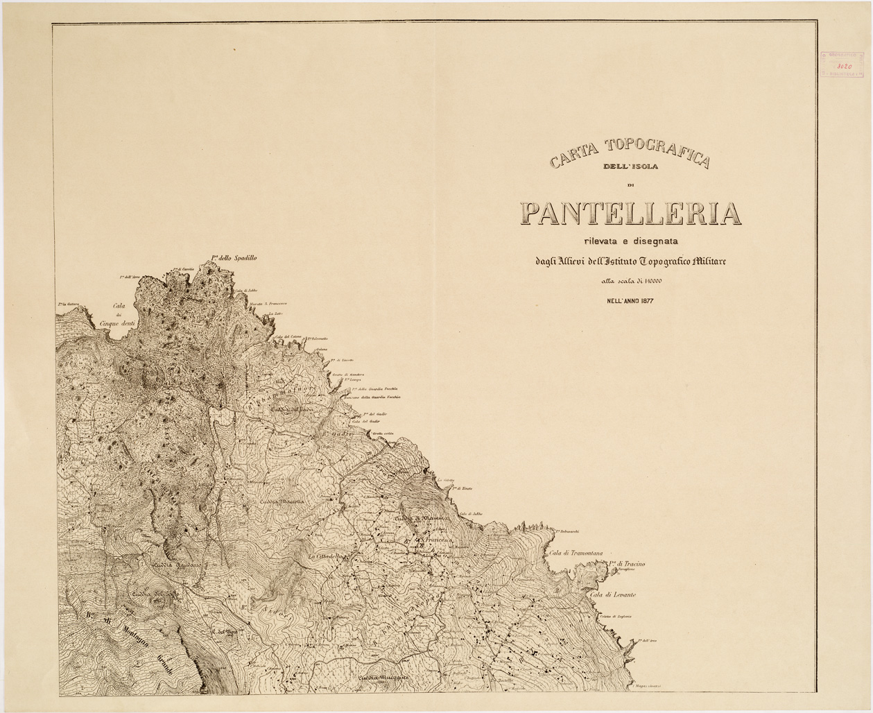 "...RILEVATA E DISEGNATA DAGLI ALLIEVI DELL'ISTITUTO TOPOGRAFICO MILITARE ALLA SCALA DI 1:10.000 NELL'ANNO 1877. Quattro fogli, montati su cartone. Sono i rilevamenti originali eseguiti sotto la direzione del Cap. di Stato Maggiore C. Canna. L'orografia è rappresentata mediante curve di livello tracciate all'equidistanza di m. 25 e tratteggio (rocce). Le strade sono classificate in mulattiere grandi e piccole, sentieri facili e difficili: sono inoltre indicati i muri a secco, fossi asciutti, cimiteri, case, chiese, croci, cisterne, giardini d'agrumi, molini, rovine, abitazioni preistoriche, i segnali trigonometrici, i vigneti, i boschi, gli olivi, le macchie. Il foglio sud-occidentale contiene la leggenda dei segni convenzionali e il quadro d'unione con i nomi degli ufficiali che presero parte al lavoro. Una copia a colori è presente in archivio."