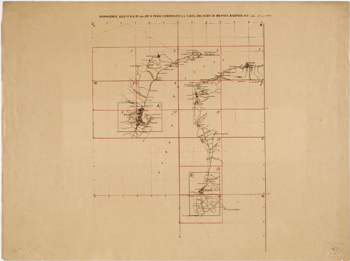 "Docum. n. 16. Carta in 16 fogli, oltre il titolo ed il quadro d'unione, riprodotti in litografia dal R. Officio Topografico di Napoli. Stampa in nero. L'orografia vi è dimostrata mediante curve tracciate all'equidistanza di cinque passi geodetici di m. 1,852 ognuno. Le piante di Messina e di Reggio Calabria sono aggiornate al 1865. Il foglio titolo contiene le scale grafiche in miglia geografiche, in palmi napoletani e in passi geometrici, in metri e in tese. La copia di questo documento è alla Sezione Vendite."