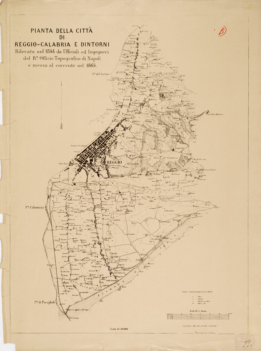 "Docum. n. 16. Carta in 16 fogli, oltre il titolo ed il quadro d'unione, riprodotti in litografia dal R. Officio Topografico di Napoli. Stampa in nero. L'orografia vi è dimostrata mediante curve tracciate all'equidistanza di cinque passi geodetici di m. 1,852 ognuno. Le piante di Messina e di Reggio Calabria sono aggiornate al 1865. Il foglio titolo contiene le scale grafiche in miglia geografiche, in palmi napoletani e in passi geometrici, in metri e in tese. La copia di questo documento è alla Sezione Vendite."