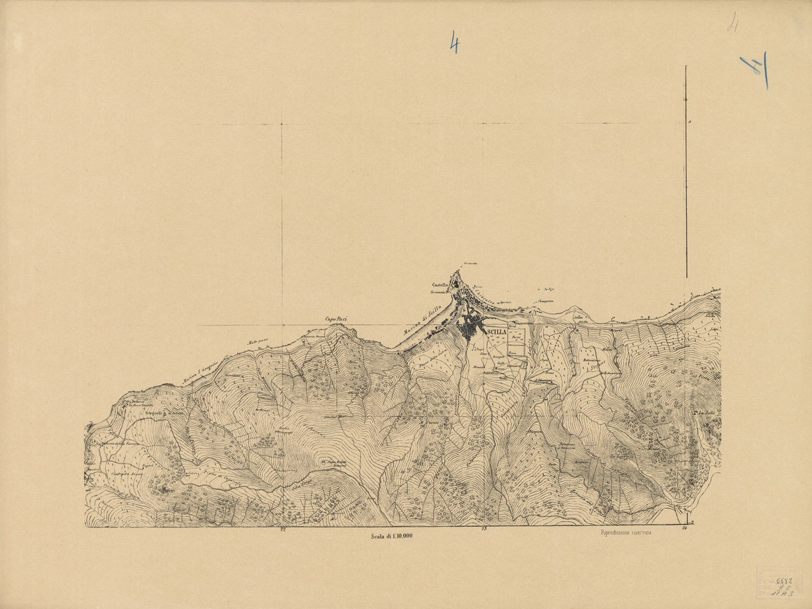 "Docum. n. 16. Carta in 16 fogli, oltre il titolo ed il quadro d'unione, riprodotti in litografia dal R. Officio Topografico di Napoli. Stampa in nero. L'orografia vi è dimostrata mediante curve tracciate all'equidistanza di cinque passi geodetici di m. 1,852 ognuno. Le piante di Messina e di Reggio Calabria sono aggiornate al 1865. Il foglio titolo contiene le scale grafiche in miglia geografiche, in palmi napoletani e in passi geometrici, in metri e in tese. La copia di questo documento è alla Sezione Vendite."