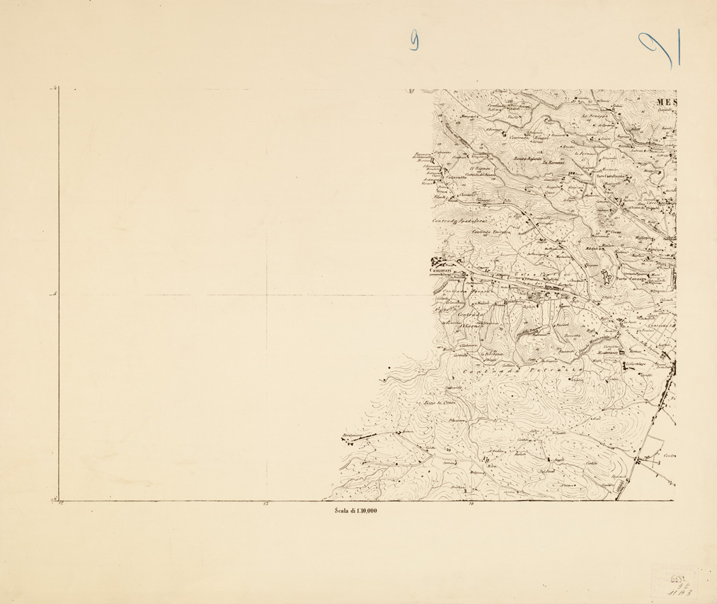 "Docum. n. 16. Carta in 16 fogli, oltre il titolo ed il quadro d'unione, riprodotti in litografia dal R. Officio Topografico di Napoli. Stampa in nero. L'orografia vi è dimostrata mediante curve tracciate all'equidistanza di cinque passi geodetici di m. 1,852 ognuno. Le piante di Messina e di Reggio Calabria sono aggiornate al 1865. Il foglio titolo contiene le scale grafiche in miglia geografiche, in palmi napoletani e in passi geometrici, in metri e in tese. La copia di questo documento è alla Sezione Vendite."