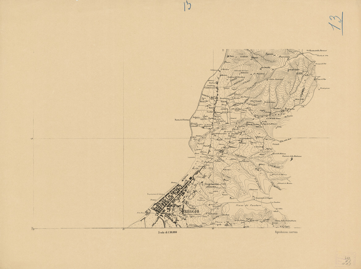 "Docum. n. 16. Carta in 16 fogli, oltre il titolo ed il quadro d'unione, riprodotti in litografia dal R. Officio Topografico di Napoli. Stampa in nero. L'orografia vi è dimostrata mediante curve tracciate all'equidistanza di cinque passi geodetici di m. 1,852 ognuno. Le piante di Messina e di Reggio Calabria sono aggiornate al 1865. Il foglio titolo contiene le scale grafiche in miglia geografiche, in palmi napoletani e in passi geometrici, in metri e in tese. La copia di questo documento è alla Sezione Vendite."