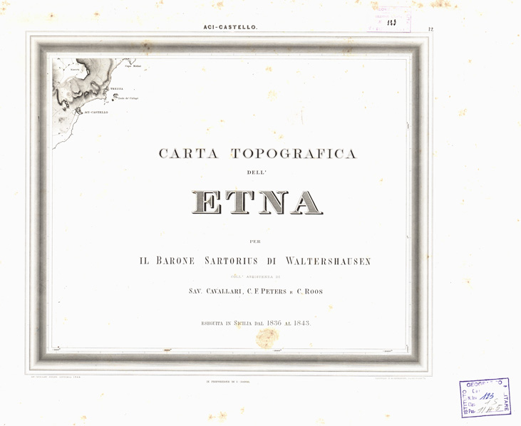 "I....PER IL BARONE SARTORIUS DI WALTERSHAUSEN COLL'ASSISTENZA DI SAV. CAVALLARI, C. F. PETERS E C. ROOS. ESEGUITA IN SICILIA DAL 1836 AL 1843. SAV. CAVALLARI SCUPLS. GOTTINGA 1844. CARATTERE DI G. SIEDENTOFF, FRANCOFORTE, S. M.. II....PER IL BARONE SARTORIUS DI WALTERSHAUSEN COLL'ASSISTENZA DI SAV. CAVALLARI, C. F. PETERS E C. ROOS ESEGUITA IN SICILIA DAL 1836 AL 1843. SAV. CAVALLARI E J. HEY SC. CARATTERE DI J. SIEDENTOFF. FRANCOFORTE S. M.. La carta si compone di 13 fogli tratti da incisione su rame, editi in Berlino da Simon Shropp dal 1844 al 1857. I titoli sono: I, Maletto II, Mojo III, Linguagrossa IV, Bronte V, Cratere VI, Giarre VII, Adernò VIII, Nicolosi IX, Aci-Reale X, Paternò XI, Catania XII, Aci Castello XIII, F. Simeto. Il foglio n. 12 contiene il titolo il foglio n. 13 della edizione geologica reca la leggenda dei colori adottati per la dimostrazione delle lave e dei terreni. Sono distinti: lave senza epoca, del Medio Evo, moderne, formazione centrale, basalto, crateri, tuffo vulcanico, jurassico, cretaceo inferiore, arenaria, conglomerati, terziario creta, terziario arene e ciottoli, gesso, alluvio. Il lavoro topografico è poggiato sui lavori trigonometrici condotti dall'A. e dal dott. Peters di Flensburg. La rete trigonometrica, derivata da una base misurata tra Portella e Gurna (Riposto) nel 1836 dal prof. Listing, venne estesa a coprire l'intero monte dell'Etna. Nel disegno topografico l'A. venne coadiuvato da C. Roos di Magonza e S. Cavallari di Palermo. Il disegno originale della carta venne eseguito in Sicilia alla scala di 1:30.000 in 100 fogli delle dimensioni ognuno di cm. 16x133 e fu ridotto quindi, per la pubblicazione, alla scala di 1:50.000. L'orografia vi è rappresentata con fine tratteggio. La carta si estende dalla foce del Simeto al cratere di Moyo (58.000 metri) e dal Capo di S. Andrea (Taormina) al Monte di Bolo (48.000 metri). Comprende quindi tutto il terreno lavico dell'Etna e le formazioni nettuniche viciniore. Alla carta sulla quale trovansi registrati tutti i materiali necessari per una completa conoscenza dell'Etna fino al 1842, va unito un testo in 21 fogli di grande formato che illustra le colate delle lave e ne fissa l'epoca contiene inoltre le coordinate dei punti trigonometrici determinati e 31 tavole incise su rame con vedute, profili e sezioni, queste ultime a colori."