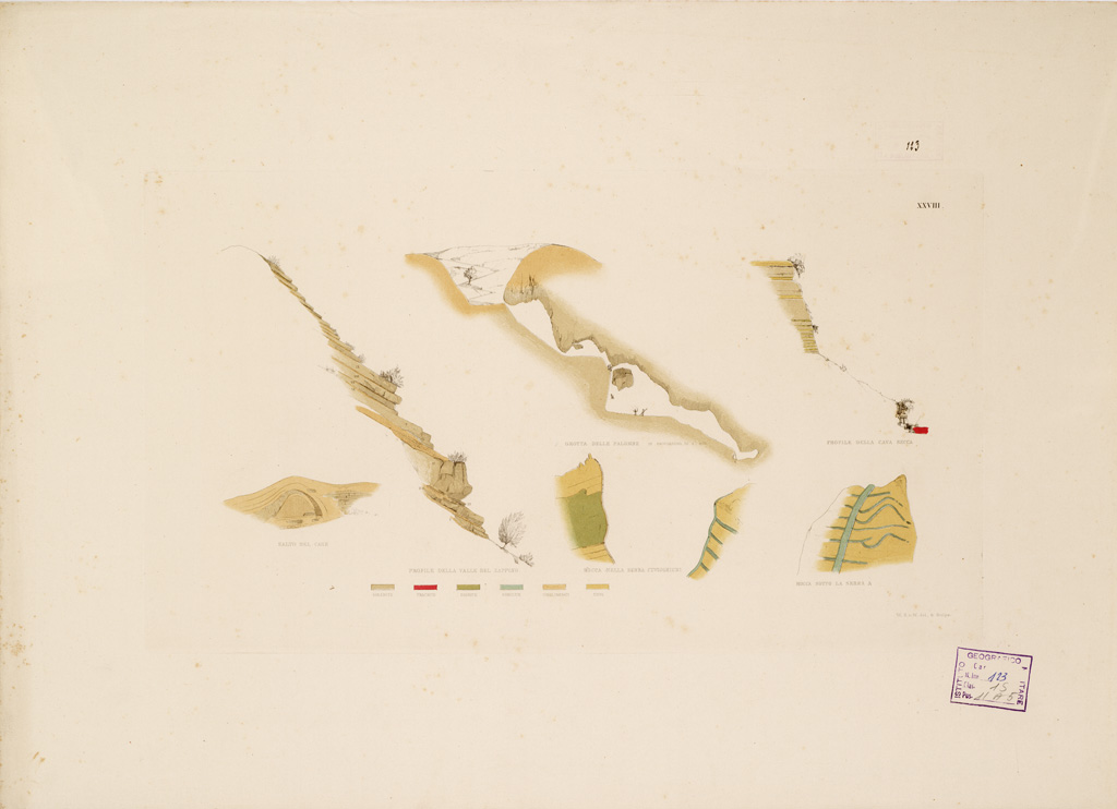"I....PER IL BARONE SARTORIUS DI WALTERSHAUSEN COLL'ASSISTENZA DI SAV. CAVALLARI, C. F. PETERS E C. ROOS. ESEGUITA IN SICILIA DAL 1836 AL 1843. SAV. CAVALLARI SCUPLS. GOTTINGA 1844. CARATTERE DI G. SIEDENTOFF, FRANCOFORTE, S. M.. II....PER IL BARONE SARTORIUS DI WALTERSHAUSEN COLL'ASSISTENZA DI SAV. CAVALLARI, C. F. PETERS E C. ROOS ESEGUITA IN SICILIA DAL 1836 AL 1843. SAV. CAVALLARI E J. HEY SC. CARATTERE DI J. SIEDENTOFF. FRANCOFORTE S. M.. La carta si compone di 13 fogli tratti da incisione su rame, editi in Berlino da Simon Shropp dal 1844 al 1857. I titoli sono: I, Maletto II, Mojo III, Linguagrossa IV, Bronte V, Cratere VI, Giarre VII, Adernò VIII, Nicolosi IX, Aci-Reale X, Paternò XI, Catania XII, Aci Castello XIII, F. Simeto. Il foglio n. 12 contiene il titolo il foglio n. 13 della edizione geologica reca la leggenda dei colori adottati per la dimostrazione delle lave e dei terreni. Sono distinti: lave senza epoca, del Medio Evo, moderne, formazione centrale, basalto, crateri, tuffo vulcanico, jurassico, cretaceo inferiore, arenaria, conglomerati, terziario creta, terziario arene e ciottoli, gesso, alluvio. Il lavoro topografico è poggiato sui lavori trigonometrici condotti dall'A. e dal dott. Peters di Flensburg. La rete trigonometrica, derivata da una base misurata tra Portella e Gurna (Riposto) nel 1836 dal prof. Listing, venne estesa a coprire l'intero monte dell'Etna. Nel disegno topografico l'A. venne coadiuvato da C. Roos di Magonza e S. Cavallari di Palermo. Il disegno originale della carta venne eseguito in Sicilia alla scala di 1:30.000 in 100 fogli delle dimensioni ognuno di cm. 16x133 e fu ridotto quindi, per la pubblicazione, alla scala di 1:50.000. L'orografia vi è rappresentata con fine tratteggio. La carta si estende dalla foce del Simeto al cratere di Moyo (58.000 metri) e dal Capo di S. Andrea (Taormina) al Monte di Bolo (48.000 metri). Comprende quindi tutto il terreno lavico dell'Etna e le formazioni nettuniche viciniore. Alla carta sulla quale trovansi registrati tutti i materiali necessari per una completa conoscenza dell'Etna fino al 1842, va unito un testo in 21 fogli di grande formato che illustra le colate delle lave e ne fissa l'epoca contiene inoltre le coordinate dei punti trigonometrici determinati e 31 tavole incise su rame con vedute, profili e sezioni, queste ultime a colori."