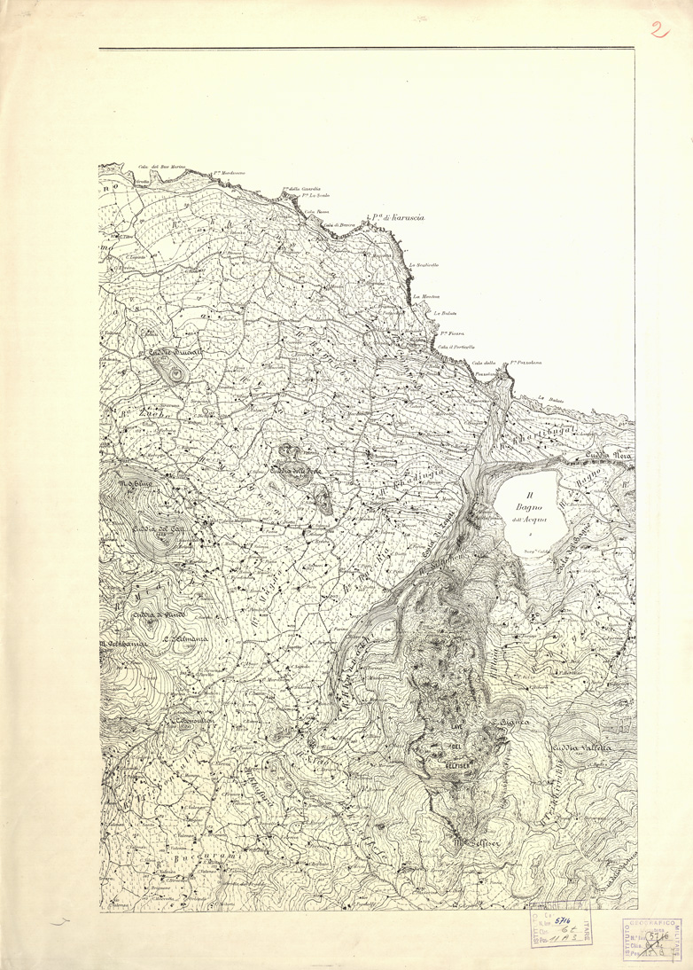 "...RILEVATA E DISEGNATA DAGLI ALLIEVI DELL'ISTITUTO TOPOGRAFICO MILITARE ALLA SCALA DI 1:10.000 NELL'ANNO 1877. Riproduzione fotolitografica della carta, in quattro fogli, alla Cartella d'Archivio n. 95 - Documento n. 29 - Categ. 9391 - Consultabile ai numeri di Files A0002715-18. La stessa riproduzione fotolitografica è in appartenenza anche all'Archivio Topocartografico (Cartella d'Archivio n. 95 - Documento n. 29 - Categ. 9391 - cfr. i Files A0002719-26). Questa la descrizione della carta d'Archivio in quattro fogli. "Quattro fogli, montati su cartone. Sono i rilevamenti originali eseguiti sotto la direzione del Cap. di Stato Maggiore C. Canna, disegnati a colore, riuniti a mosaico, pronti per la riproduzione fotolitografica. L'orografia è rappresentata mediante curve di livello tracciate all'equidistanza di m. 25 in bistro e tratteggio (rocce), gli abitati sono in rosso, le acque sono in azzurro, le strade sono classificate in mulattiere grandi e piccole, sentieri facili e difficili: sono inoltre indicati i muri a secco, fossi asciutti, cimiteri, case, chiese, croci, cisterne, giardini d'agrumi, molini, rovine, abitazioni preistoriche, i segnali trigonometrici, i vigneti, i boschi, gli olivi, le macchie. Il foglio sud-occidentale contiene la legenda dei segni convenzionali e il quadro d'unione con i nomi degli ufficiali che presero parte al lavoro". Sempre in appartenenza alla Biblioteca un'altra copia fotolitografica in quattro fogli in bianco e nero - numero d'Inv. 8020 - Files B0005180-83."