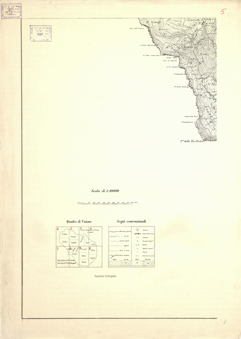 "...RILEVATA E DISEGNATA DAGLI ALLIEVI DELL'ISTITUTO TOPOGRAFICO MILITARE ALLA SCALA DI 1:10.000 NELL'ANNO 1877. Riproduzione fotolitografica della carta, in quattro fogli, alla Cartella d'Archivio n. 95 - Documento n. 29 - Categ. 9391 - Consultabile ai numeri di Files A0002715-18. La stessa riproduzione fotolitografica è in appartenenza anche all'Archivio Topocartografico (Cartella d'Archivio n. 95 - Documento n. 29 - Categ. 9391 - cfr. i Files A0002719-26). Questa la descrizione della carta d'Archivio in quattro fogli. "Quattro fogli, montati su cartone. Sono i rilevamenti originali eseguiti sotto la direzione del Cap. di Stato Maggiore C. Canna, disegnati a colore, riuniti a mosaico, pronti per la riproduzione fotolitografica. L'orografia è rappresentata mediante curve di livello tracciate all'equidistanza di m. 25 in bistro e tratteggio (rocce), gli abitati sono in rosso, le acque sono in azzurro, le strade sono classificate in mulattiere grandi e piccole, sentieri facili e difficili: sono inoltre indicati i muri a secco, fossi asciutti, cimiteri, case, chiese, croci, cisterne, giardini d'agrumi, molini, rovine, abitazioni preistoriche, i segnali trigonometrici, i vigneti, i boschi, gli olivi, le macchie. Il foglio sud-occidentale contiene la legenda dei segni convenzionali e il quadro d'unione con i nomi degli ufficiali che presero parte al lavoro". Sempre in appartenenza alla Biblioteca un'altra copia fotolitografica in quattro fogli in bianco e nero - numero d'Inv. 8020 - Files B0005180-83."
