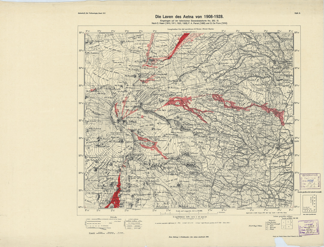 "Rappresentazione orografica a curve di livello l'equidistanza delle curve è di metri 50, per le curve punteggiate di metri 10. In basso a sinistra la legenda delle strade e dei limiti amministrativi. I. Frieslander Reimer, Berlin."
