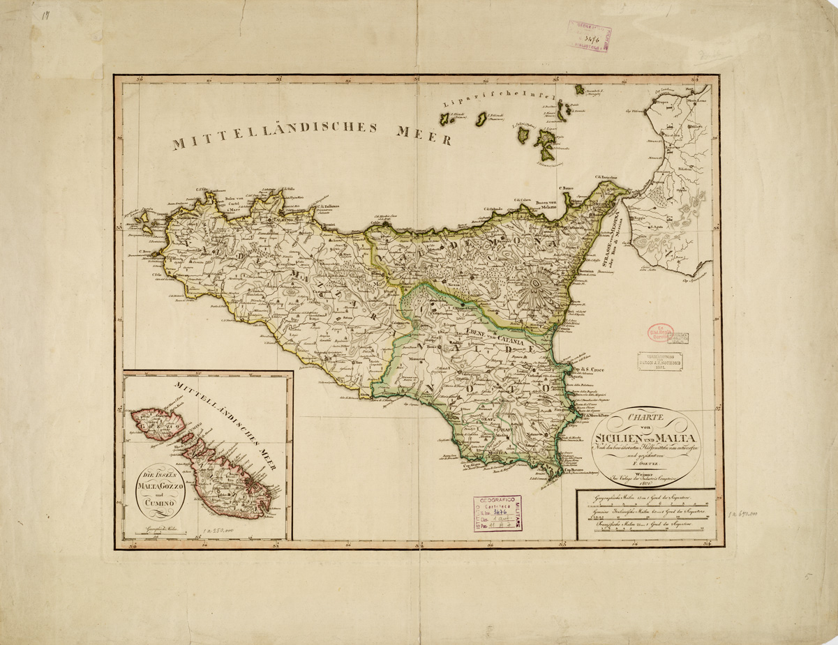 "Rappresentazione orografica a tratteggio. In basso a sinistra recasi la carta di "Malta, Gozzo e Cumino" alla scala di 1:250.000. F. Goetze, Weimar."