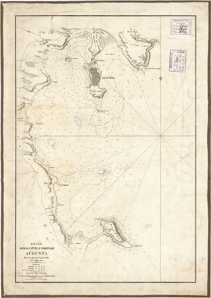 "...RILEVATO DAL CAP. SMYTH DELLA REALE MARINA BRITANNICA, 1823. Incisione su rame in foglio unico, riproduzione dell'originale inglese eseguita dal Reale Officio Topografico di Napoli. Annesso lo stesso originale, pubblicato a Londra dall'Ufficio Idrografico inglese. L'orografia è rappresentata col tratteggio. Gli scandagli sono calcolati in fathoms e nella riproduzione in piedi parigini. Carta analoga a quella al numero d'ordine 26 cartella d'archivio n. 89 documenti n. 10-11."