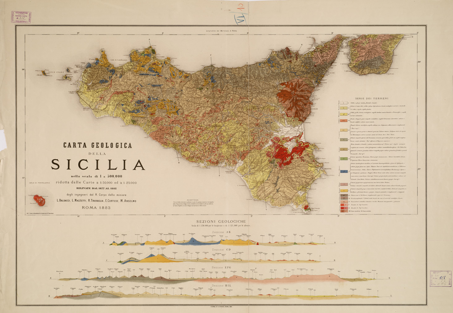 ".NELLA SCALA DI 1:500.000 RIDOTTA DALLE CARTE A 1:50.000 ED A 1:25.000 RILEVATE DAL 1877 AL 1882 DAGLI INGEGNERI DEL R. CORPO DELLE MINIERE. L. BALDACCI, L. MAZZETTI, R. TRAVAGLIA, E. CORTESE, M. ANSELMO, R. STAB. LIT. C. VIRANO. ROMA, 1883. Un foglio stampato a colori. A destra la leggenda delle tinte impiegate per la dimostrazione geologica. In basso sezioni geologiche alla scala di 1:250 mila per le lunghezze e di 1:125.000 per le altezze. Due copie una delle quali reca scritto, sotto al titolo: "La presente serve di quadro d'unione per la carta geologica di Sicilia stampata alla scala di 1:100.000 in 27 fogli" essendovi infatti tracciata la ripartizione dei fogli di quella carta."