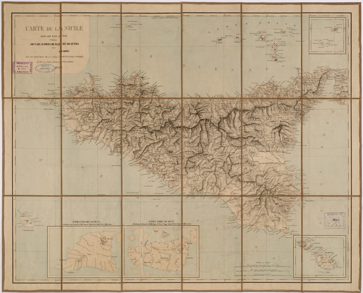 CARTE DE LA SICILE DANS SON ETAT ACTUEL PUBLIEE SOUS LES AUSPICES DE M. LE DUC DE LUYNES PAR.... M. AMARI AVEC LES REDUCTIONS DE LA CARTE ANCIENNE D'APRES PTOLEMEE ET DE LA CARTE ARABE D'APRES EDRISI, 1859 - Sicilia, Isola di Malta