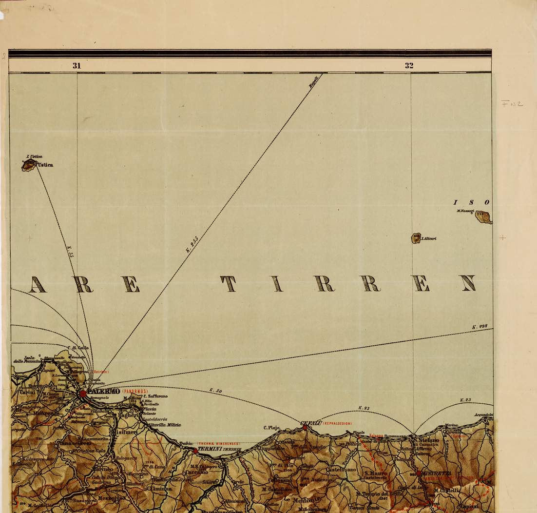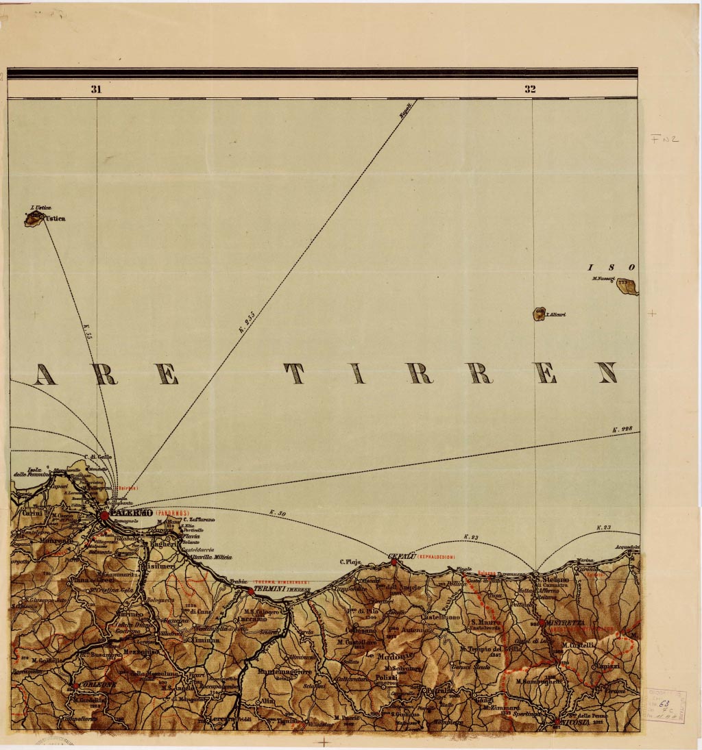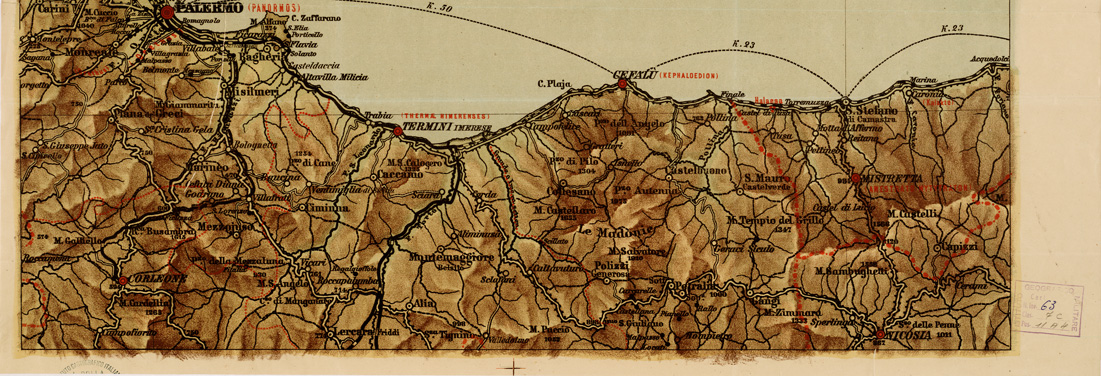 GRANDE CARTA MURALE DELLA SICILIA FISICA, POLITICA, STORICA E COMMERCIALE COSTRUITA E DIRETTA DAL PROF. G. GAMBINO DEL R. ISTITUTO TECNICO DI PALERMO. PALERMO, REMO SANDRON EDIT - Foglio 2 - Palermo, Enna, Messina