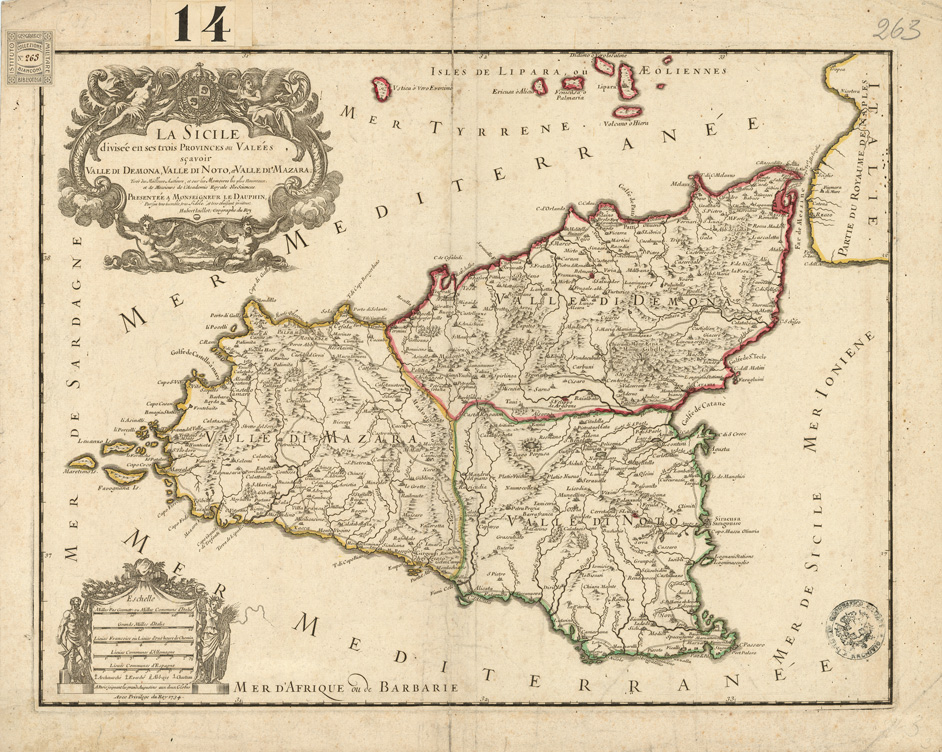 "...OU VALEES SCAVOIR (SIC) VALLE DE DEMONA, VALLE DI NOTO, ET VALLE DI MAZARA TIREE DES MEILLEUR AUTHEURS, ET SUR LES MEMOIRES, LES PLUS NOUVEAUX ET DE MESSIEURS DE L'ACADEMIE ROYALE DES SCIENCES PRESENTEE A MONSEIGNEUR LE DAUPHIN PAR SON TRES HUMBLE, ECC., ECC. HUBERT JAILLOT GEOGRAPHE DU ROY. AVEC PRIVILEGE DU ROY, 1734. Foglio unico inciso su rame. Orientazione normale. Longitudini calcolate dal meridiano dell'Isola del Ferro. Orografia prospettica a monticelli. E' tracciata la rete stradale. Sono indicati i boschi. Limiti amministrativi a colori. Cinque scale grafiche in misure antiche."