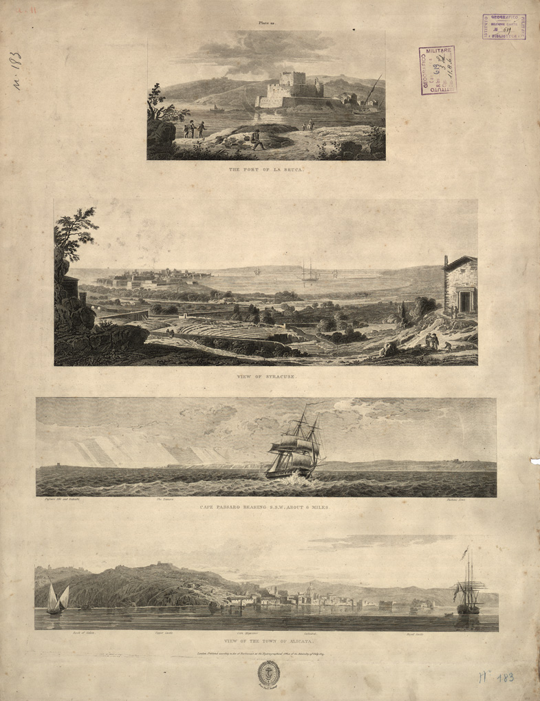 THE PORT OF LA BRUCA, VIEW OF SYRACUSE, CAPE PASSARO BEARING S.S.W. ABOUT 6 MILES, VIEW OF THE TOWN OF ALICATA