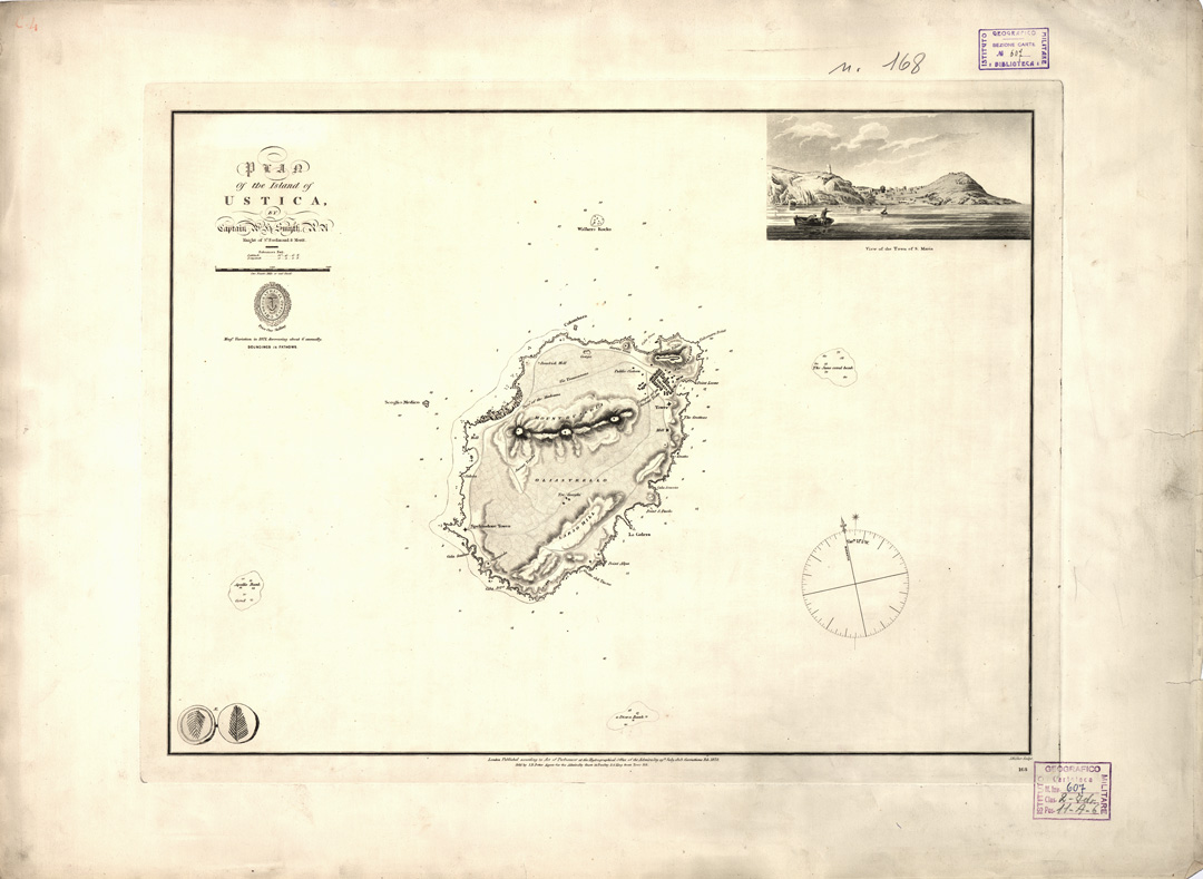 "...BY CAPTAIN SMYTH. KNIGHT OF ST. FERDINAND & MERIT. Rappresentazione orografica a tratteggio. In alto a destra la veduta della città di S. Maria. J. Walker sculpt. Ammiragliato Britannico, Londra."
