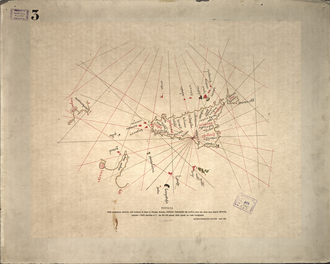 "Dalla pergamena esistente nell'Archivio di Stato in Firenze, firmata: Petrus Vesconte de Janua fecit ista carta anno domini MCCCXI, segnata: carte nautiche n. 1, cm. 48x62 (grand. della riprod. tre volte l'originale). La scala sopra la carta è scritta a lapis. I.G.M. (FI)."