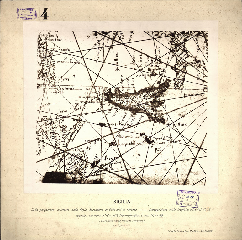 "Dalla pergamena esistente nella Regia Accademia di Belle Arti in Firenze. Sottoscrizione male leggibile, a. (certo) 1532. Segnata: nel retro n. 10, n. 2 Marinelli, dim. l. cm. 71,5x48 (grand. della riprod. tre volte l'originale). La scala è scritta a lapis. I.G.M. (FI)."
