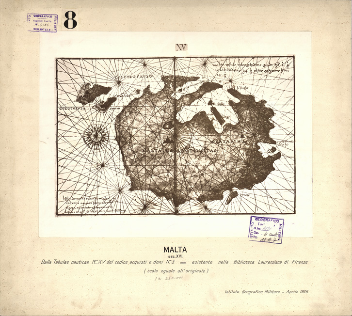 "Dalla Tabulae nauticae N.° XV del codice acquisti e doni N.° 3, esistente nella Biblioteca Laurenziana di Firenze (scala eguale all'originale). La scala è scritta a lapis. I.G.M. (FI)."