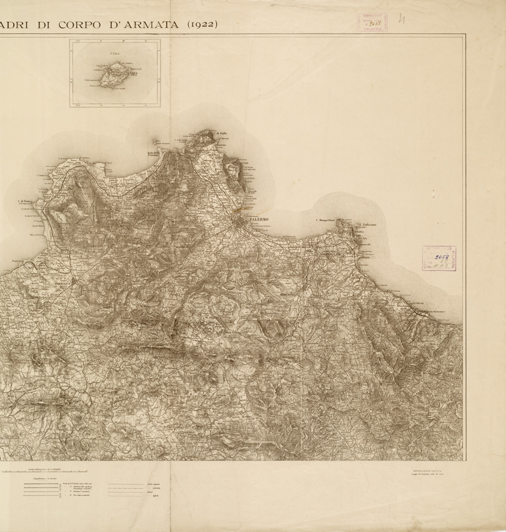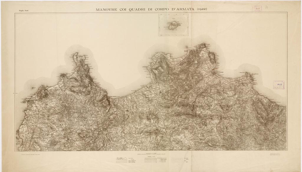 "Rappresentazione orografica a tratteggio e a curve di livello, l'equidistanza è di 50 metri. In basso è presente la legenda delle strade e nel riquadro sotto al titolo l'isola di Ustica."