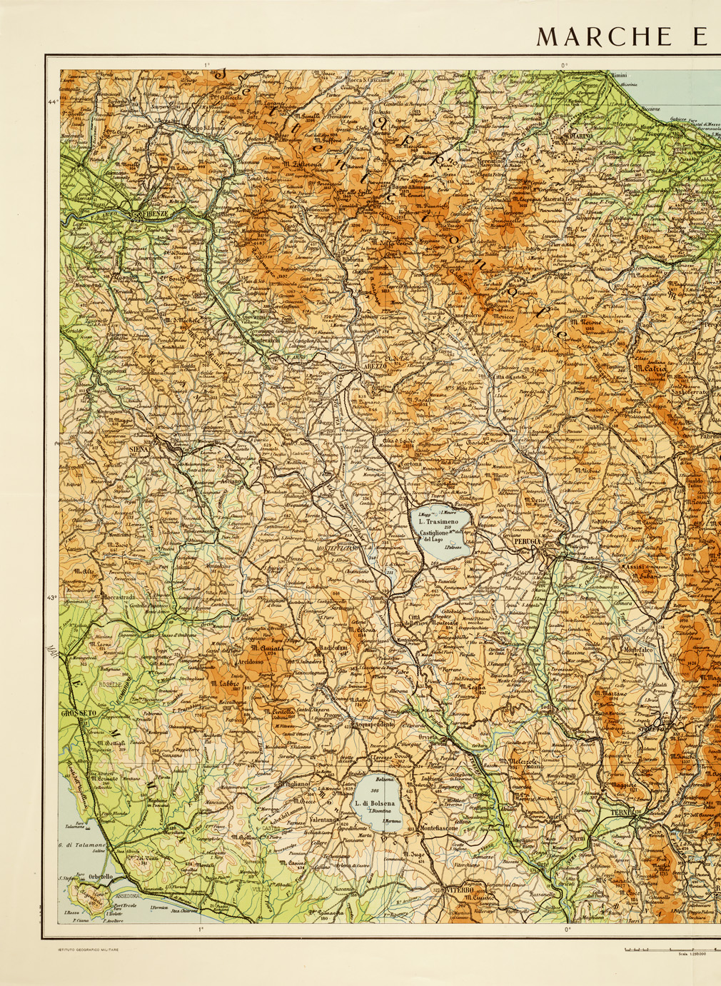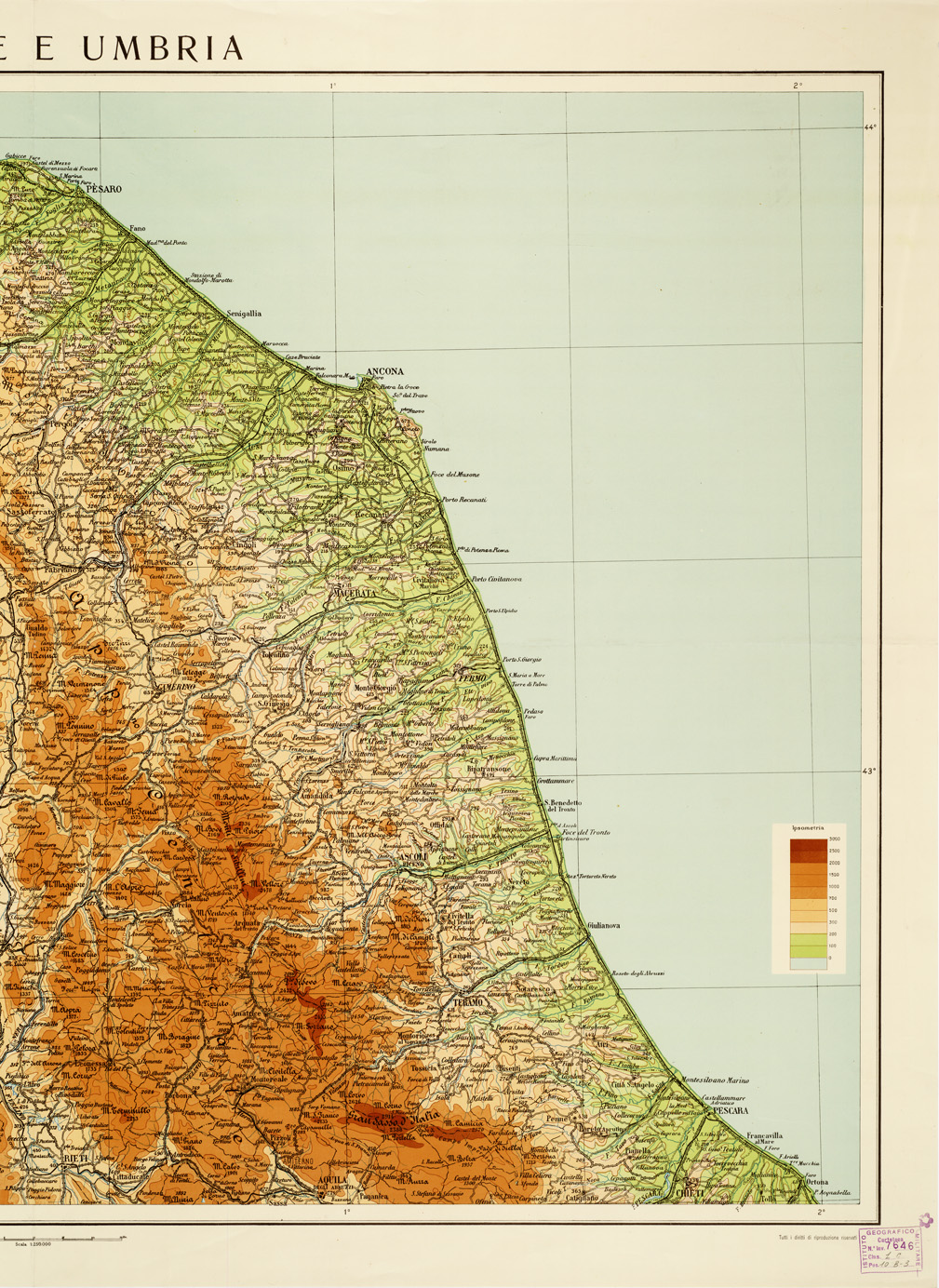 "Rappresentazione orografica a tinte ipsometriche. Sulla destra è presente l'elenco dell'ipsometria. I.G.M. (FI)."