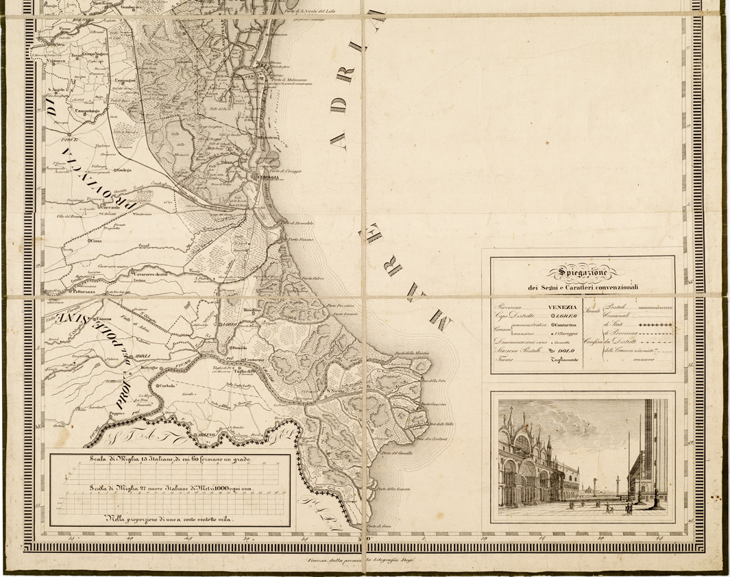 "Foglio unico montato su tela a stacchi. Incisione su rame. Orientazione normale, longitudini derivate dal meridiano dell'Isola del Ferro. Abitati distinti in base alla loro importanza amministrativa. Strade classificate in postali e comunali. Confini politici e amministrativi. In basso, a destra, una veduta di Piazza San Marco. Cfr. MARINELLI, Saggio, ecc., n. 1639."