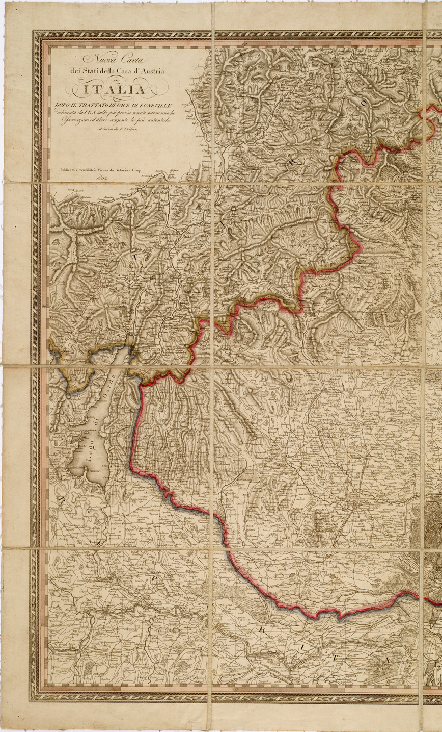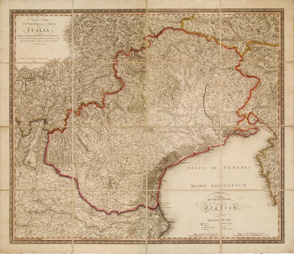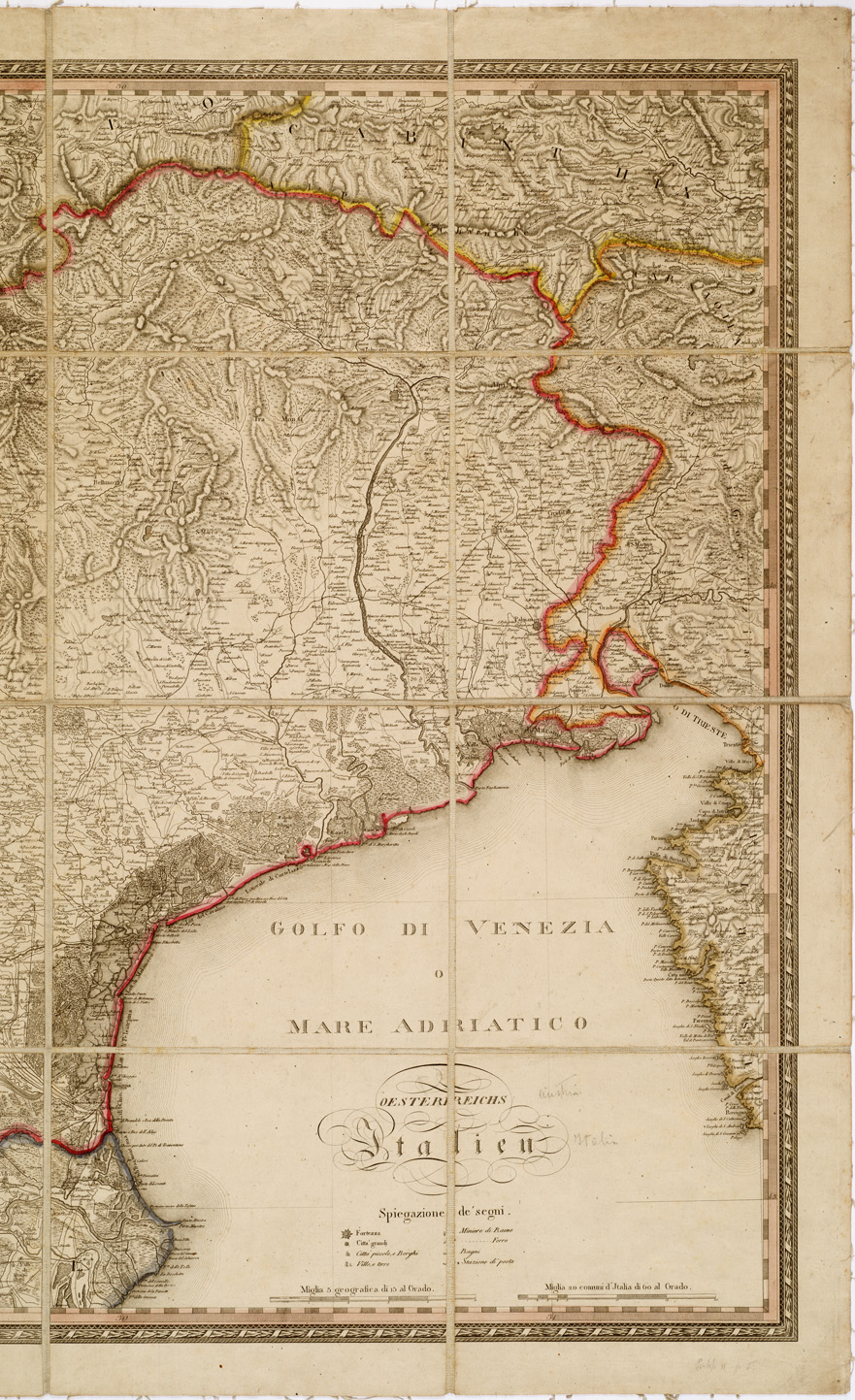 "PUBBLICATA E VENDIBILE IN VIENNA DA ARTARIA E COMP. Carta in quattro fogli incisi su rame riuniti e montati su tela a stacchi. Meridiano d'origine quello dell'Isola del Ferro. Limiti: nord, Prunecken sud, Mirandola est, Trieste ovest, Lonata. Orografia a tratteggio a luce zenitale. Le fortezze e le città grandi sono rappresentate schematicamente in pianta. Gli altri abitati con torri e case. Sono pure indicate le miniere di rame, di ferro, le stazioni di posta, ecc. Sono tracciate le strade. Confini a colori. Scale grafiche in miglia d'Italia. Autore Y.E.S. (Stein). Cfr. MARINELLI, Saggio, ecc., n. 1428."
