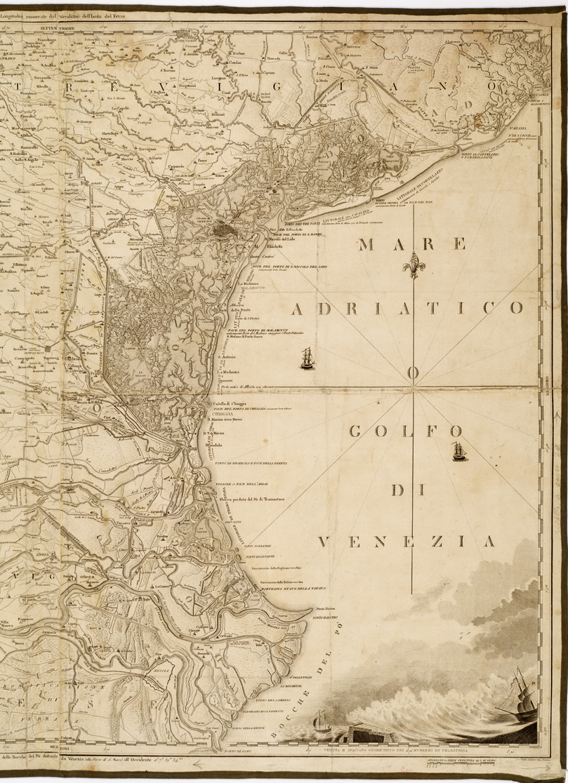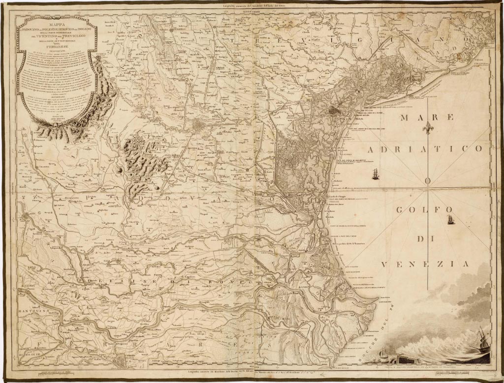 "Carta costruita da G. Valle e incisa da P. Zuliani. Foglio unico montato su tela. Incisione su rame. Orientazione normale. Proiezione sferica. Longitudini riferite al meridiano dell'Isola del Ferro e a quello delle Bocche del Po (0° 7' 51" 34"' a ovest di Venezia - Torre di S. Marco). Orografia prospettica. Abitati principali rappresentati schematicamente in pianta: gli altri con torri e case. Sono tracciate le strade e delineati i confini. La carta è ricca anche di indicazioni di carattere idrografico e idraulico. Reca inoltre i nomi antichi e moderni di porti e fiumi, ecc. la data di costruzioni di canali, ecc. In alto a sinistra sotto il titolo una leggenda circa la costruzione della carta. Due scale grafiche in miglia d'Italia e in piedi veneti. Cfr. MARINELLI, Saggio, ecc., n. 1394. La stessa carta è presente alla cartella d'archivio n. 58 documento n. 21."