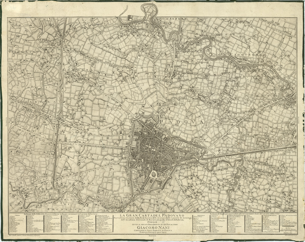 "...SOTTO IL FELICE REGGIMENTO DI S. E. KAVALIERE GIACOMO NANI, CAPITANIO E VICE PODESTA' DI PADOVA, PROMOTORE GENEROSO DI QUEST'OPERA. Foglio primo della carta del Padovano del Rizzi-Zannoni, incisa su rame. Essa doveva comporsi di 12 fogli dei quali quattro soltanto apparvero stampati. Questa carta, poggiata su regolare triangolazione è, com'è noto, una delle prime produzioni della cartografia italiana moderna. Il foglio posseduto è montato su tela. Reca scritto in basso: "Ign.° Colombo cominciò: Antonio Buttafuoco perfezionò". "Formalconi scrisse", indi la scala (300 pertiche padovane) e la data. V'è inserito un elenco numerico delle costruzioni principali entro e fuori il recinto di Padova. Limiti: nord, Vigordazere sud, Bassanello est, Noventa ovest, lo scolo detto la Storta. Cfr. MARINELLI, Saggio, ecc., n. 1226."