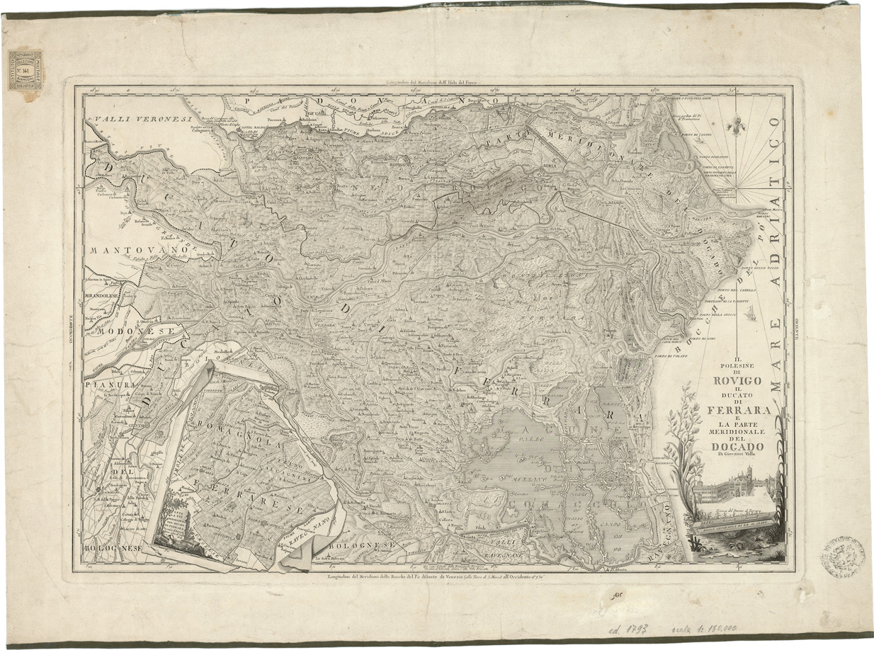 "Foglio unico inciso su rame montato su tela. Longitudini derivate dal meridiano dell'Isola del Ferro e dal Meridiano delle Bocche del Po (Porto Tolle?) calcolato distante da Venezia (Torre di S. Marco) di 0° 7' 50" a ovest. Scala grafica in miglia italiane. In basso una cartina complementare per la parte più meridionale del Ducato di Ferrara. Abitati principali rappresentati schematicamente in pianta: gli altri con torri e case. Sono tracciate le strade e delineati i confini. Ricca l'idrografia. Veduta della Piazza del Duomo di Ferrara. Cfr. MARINELLI, Saggio, ecc., n. 1282."
