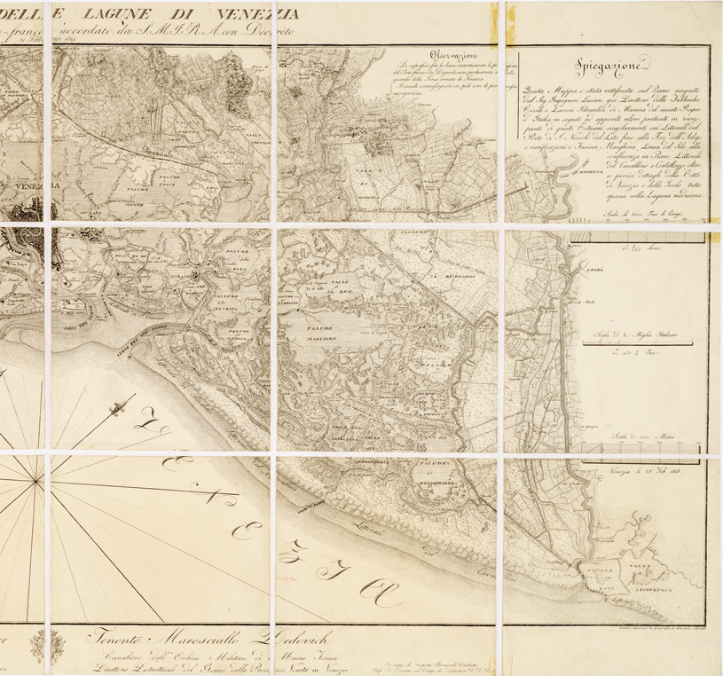 "Incisione su rame di Dionisio Moretti su disegno di B. Combatti, dedicata al Ten. Maresciallo Dedovich. Una nota a destra in alto avverte che la carta è stata "rettificata sul Piano eseguito dal Sig. Ingegnere Lessau". Segue in basso la data originale della carta: "Venezia li 28 feb. 1818". Orientazione nord a destra. Sono rappresentati strade, canali, coltivazioni, ecc. Tre scale grafiche in tese di Parigi, miglia d'Italia e in metri. Due copie montate su tela a stacchi in foglio unico. La copia Collez. Pasqui n. 9 è piegata e contenuta in libretto. Cfr. MARINELLI, Saggio, ecc., n. 1499."