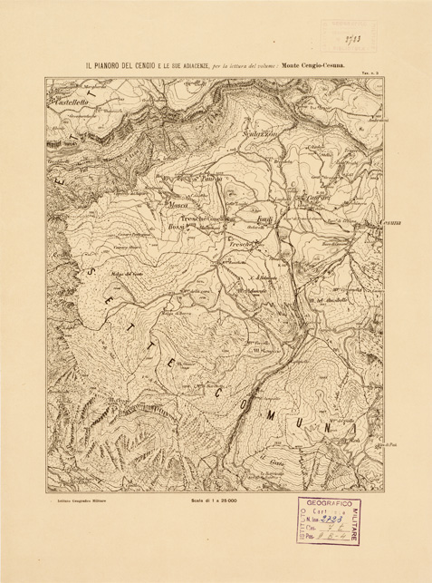 "...PER LA LETTURE DEL VOLUME: MONTE CENGIO-CESUNA. Rappresentazione orografica a curve di livello. I.G.M. (FI)."